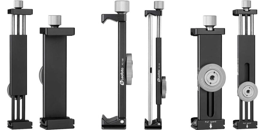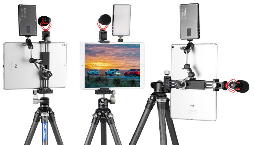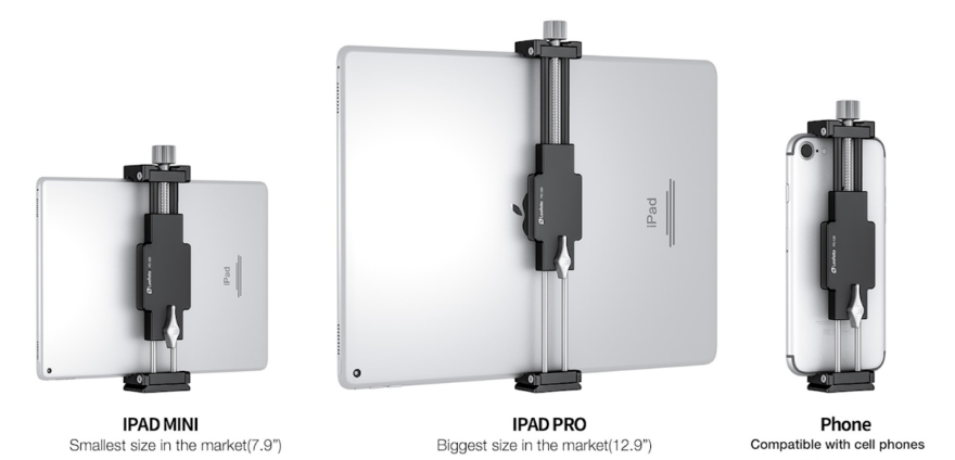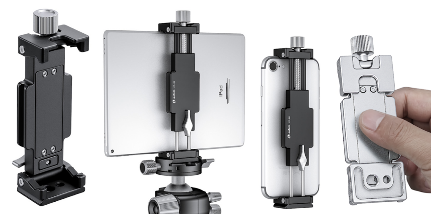 Neu ist der Tablet- und Smartphone Halter PC-120, der sich als Weiterentwicklung der beiden bisherigen Modellen PC-120 und PC-230 (siehe unten) versteht. Er ist kompakt zusammenlegbar, hat eine universelle Spannweite von 9 bis 23 cm und klemmt damit so ziemlich jedes Tablet und Smartphone (im Hochformat) – vom Kleinsten (beispielsweise iPad Mini) bis zum Grössten (zum Beispiel iPad Pro) fest. Dazu ermöglicht der Tablethalter eine Vielzahl von Befestigungen an allen Seiten. Vom Arca-Swiss Schnellwechsel-System für Stative an der Rück- und Unterseite, über den Zubehörschuh (Cold-Shoe) an der Oberseite, bis hin zu den gängigen 1/4″ sowie 3/8″ Gewindeanschlüssen bietet der PC-120 vielfältige Kombinationsmöglichkeiten.