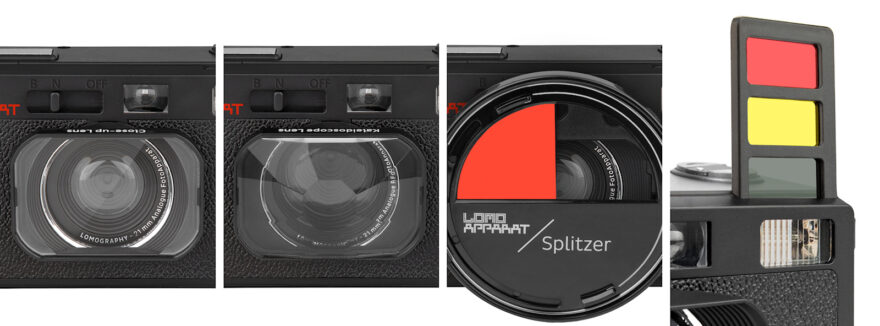 Eine Nahaufnahmelinse, eine Kaleidoskoplinse, ein Splitzer-Vorsatz und vier Blitzfilter gehören zum mitgelieferten Zubehör