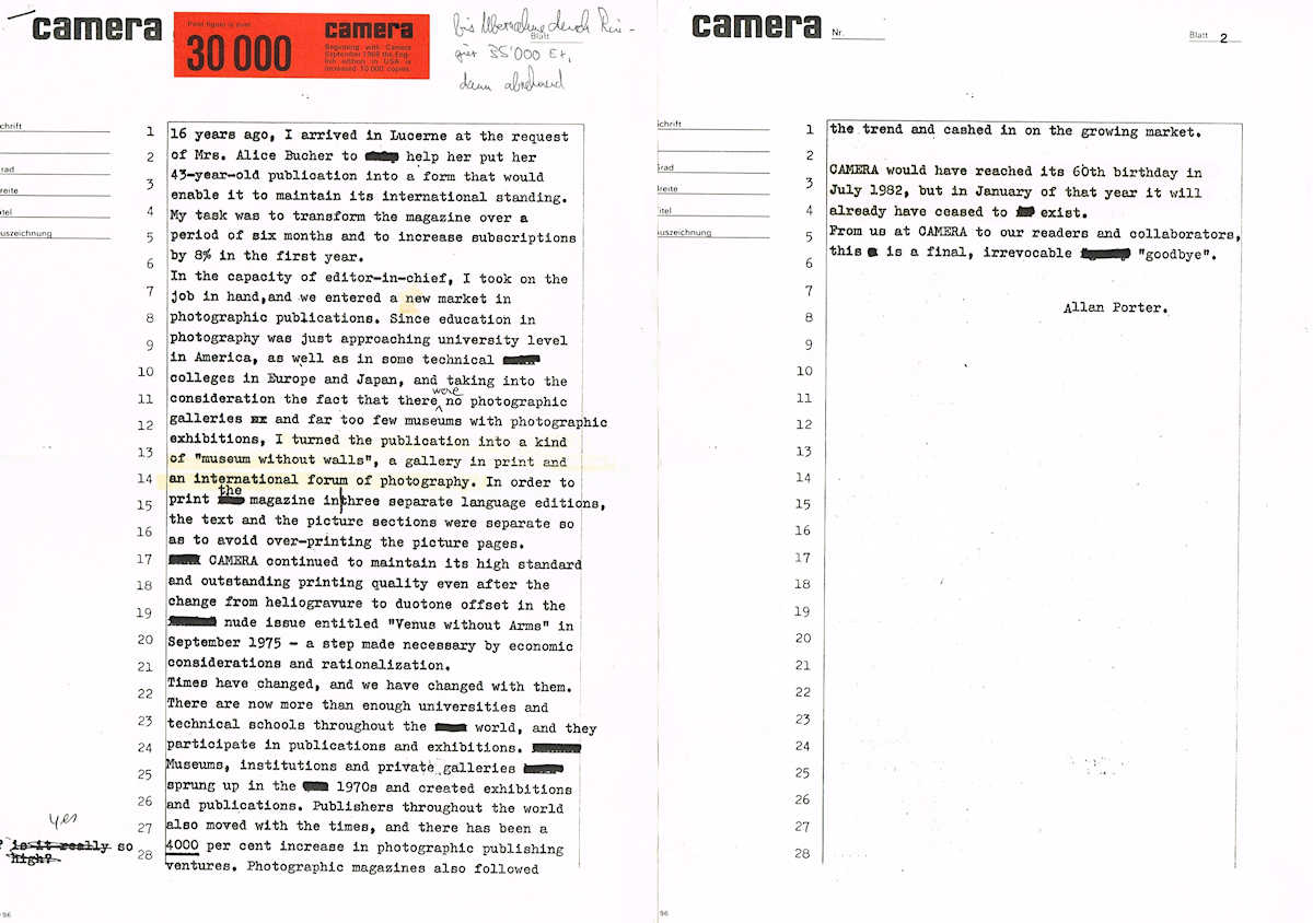 Es war in der zweiten Novemberhälfte 1981, als mich Allan Porter, der Chefredakteur des Schweizer Fotomagazins «camera», anrief: «camera is at its end – do you want to write about it?» sagte er, Camera ist am Ende – willst Du etwas darüber schreiben? Ich war sprachlos. Sprachlos, nicht, weil wieder eine, wahrscheinlich die beste, Fotozeitschrift ihr Erscheinen einstellen musste. Bei dem geringen Anzeigenaufkommen der letzten Monate war es absehbar, dass der Verlag Ringier dieses Objekt wirtschaftlich nicht mehr halten konnte. Sprachlos jedoch, mit welch stoischer Ruhe mir Allan dies mitteilte. Sein Lebenswerk, in welches er während 15 Jahren alles Herzblut und seine ganze Schaffenskraft eingebracht hatte, war am Ende.