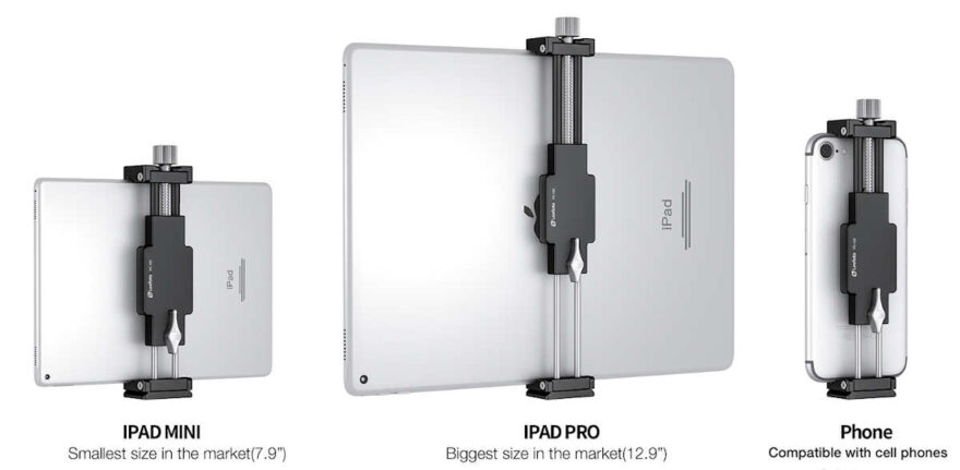 Dazu ermöglicht der Tablethalter eine Vielzahl von Befestigungen an allen Seiten. Vom Arca-Swiss Schnellwechsel-System für Stative an der Rück- und Unterseite, über den Blitzschuh (Cold-Shoe) an der Oberseite, bis hin zu den gängigen 1/4″ sowie 3/8″ Gewindeanschlüssen.
