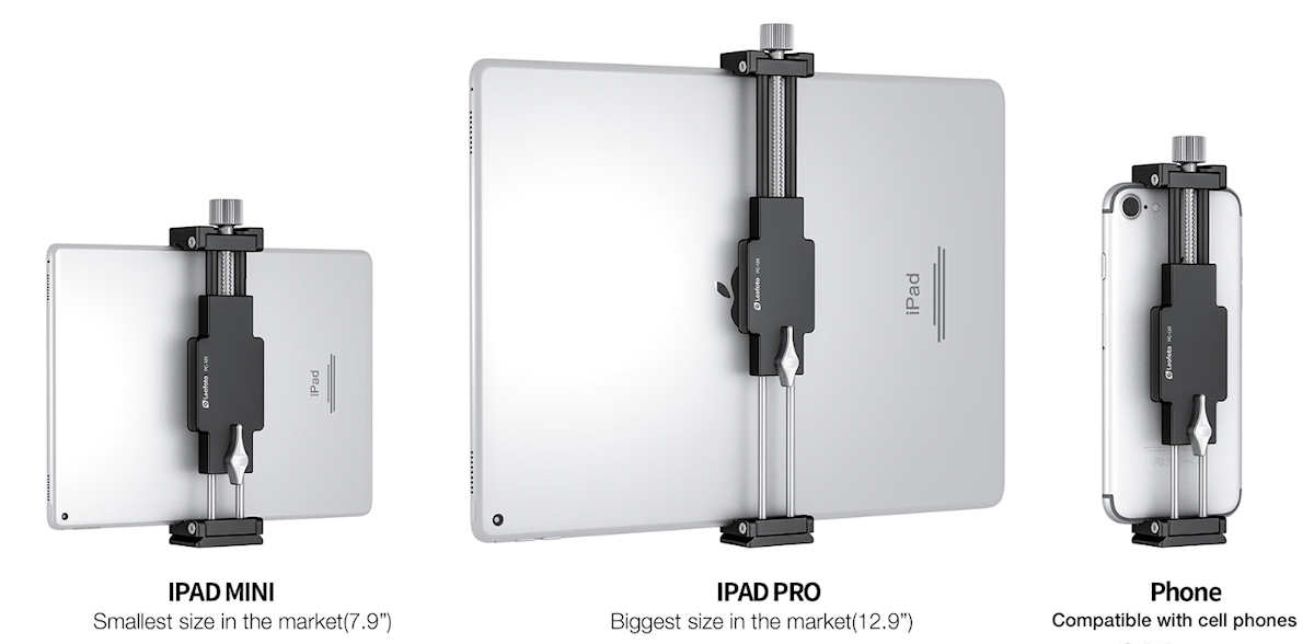 Der PC-120 ist ein durchdachtes Multitalent, wenn’s um Vielseitigkeit und Kompatibilität geht. Er klemmt so ziemlich jedes Tablet und Handy im Hochformat – vom Kleinsten (beispielsweise iPad Mini) bis zum Grössten (beispielsweise iPad Pro) fest.