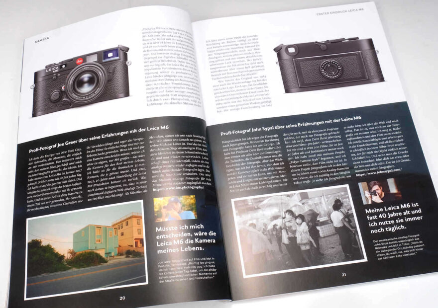 Und dann kommt er, der ersehnte Artikel über die neue Leica M6, und zwar nicht nur als nacherzählter technischer Bericht, sondern mit drei Erfahrungsberichten gestandener Profis. Es wird in der nächsten Ausgabe im März 2023 noch mehr über die M6 zu lesen sein, wie ein roter Punkt im Artikel verspricht.