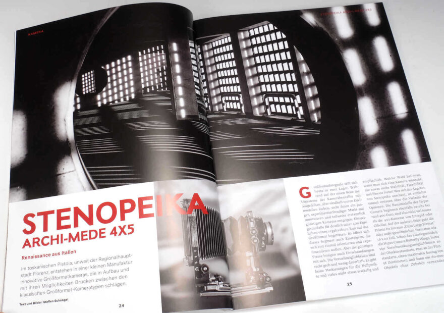 Damit nicht genug der Kamera-Neuheiten. Aus Italien kommt die Stenopeika Archi-Mede 4×5, eine neue verstellbare Fachkamera im Format 4×5 Inch, die Steffen Schüngel unter die Lupe genommen hat. Die Kamera ist als Basismodell relativ preisgünstig, doch sind teurere Modelle, anscheinend bis zum Format 40 x 50 cm, erhältlich. Der Autor des Berichts hat verschiedene Konstruktionsmerkmale und die Fertigungsqualität sehr positiv beurteilt.