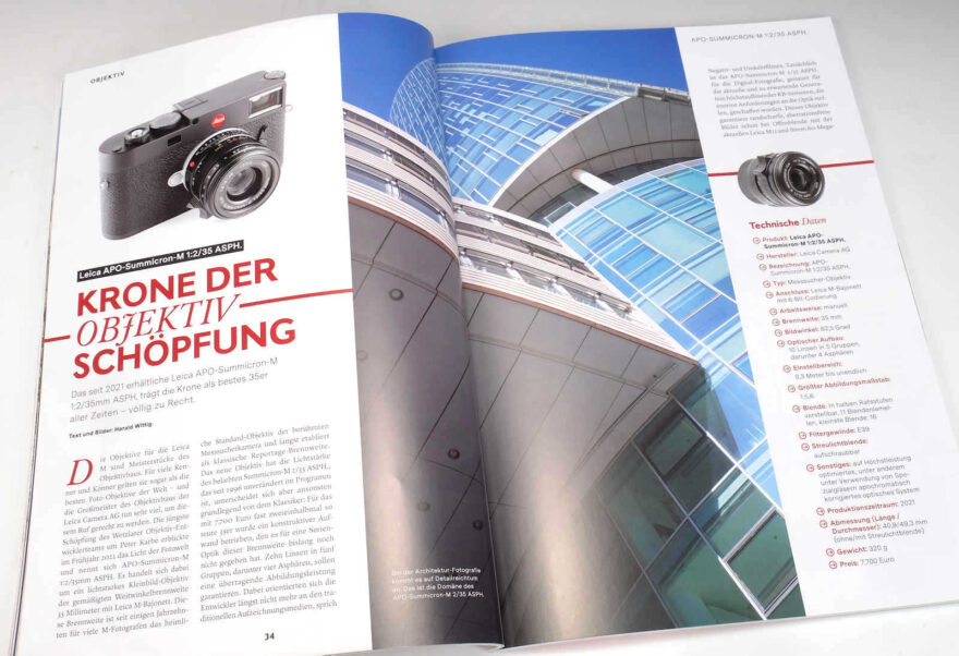 Dass das Leica APO-Summicron-M 1:2/35mm ASPH. mit «Krone der Objektiv-Schöpfung» betitelt wird, mag sehr superlativ klingen, hat jedoch nach den praktischen Erfahrungen von Autor Harald Wittig seine Berechtigung. Für ihn ist es das Universalobjektiv schlechthin, lobt die hohe optische und fertigungstechnische Qualität und belegt das Ganze mit ein paar imposanten Architekturaufnahmen.