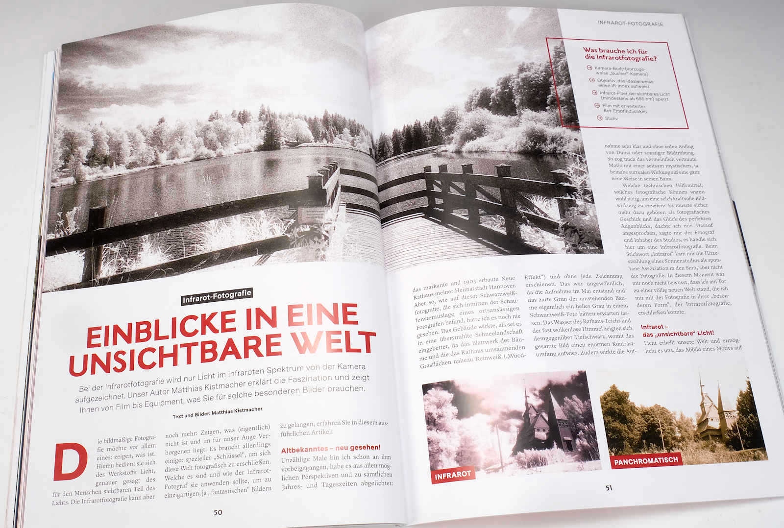 Die Infrarot-Fotografie begeistert immer wieder – das helle Chlorophyll der Laubbäume, der dramatisch schwarze Himmel, und die unglaublich klare Fernsicht in der Landschaftsfotografie. Wie macht man das? Welche Filme gibt es? Und wie ist das genau mit der Fokusdifferenz? Matthias Kistmacher erklärt in seinem umfassenden Beitrag alles über die «Fotografie im unsichtbaren Spektrum».