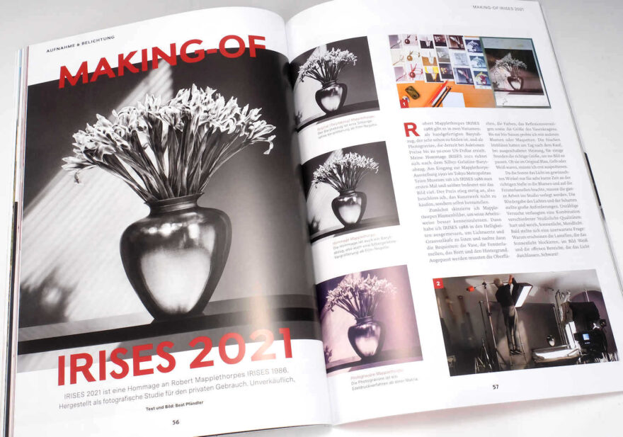 Und jetzt kommt sie, die Auflösung zum Titelfoto dieses Heftes. Nein, es ist kein echter Mapplethorp – obwohl das Bild so aussieht. Der Schweizer Fotograf Beat Pfändler, der den Fotointern-Leser/innen wohlbekannt ist, hat «Irisis 1986» exakt nachfotografiert – gleiche Vase, gleiche Blumen, gleiches Licht und ebenfalls ein edler Baryt-Print. Wie er das alles gemacht hat, steht im Artikel – und ebenso seine Überzeugung, dass es sich dabei nicht um ein Plagiat handelt, sondern um Hommage an Robert Mapplethorpe.