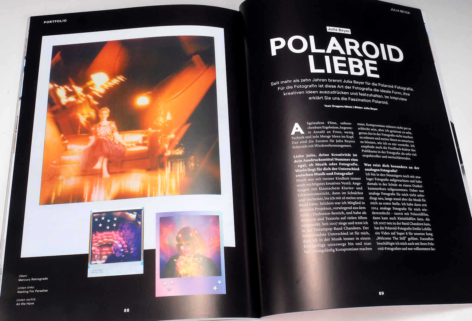 Schlusspunkt dieser Ausgabe setzt die «Polaroid Liebe», ein Portfolio von Julia Beyer, die sich seit mehr als zehn Jahren für die Sofortbildfotografie begeistert. Im Interview mit PhotoKlassik-Chefredakteurin Dragana Mimic erklärt sie, weshalb sie sich für die Polaroid-Fotografie begeistert und wie sie ihre kreativen Ideen mit dieser Technik in Unikate umsetzt.