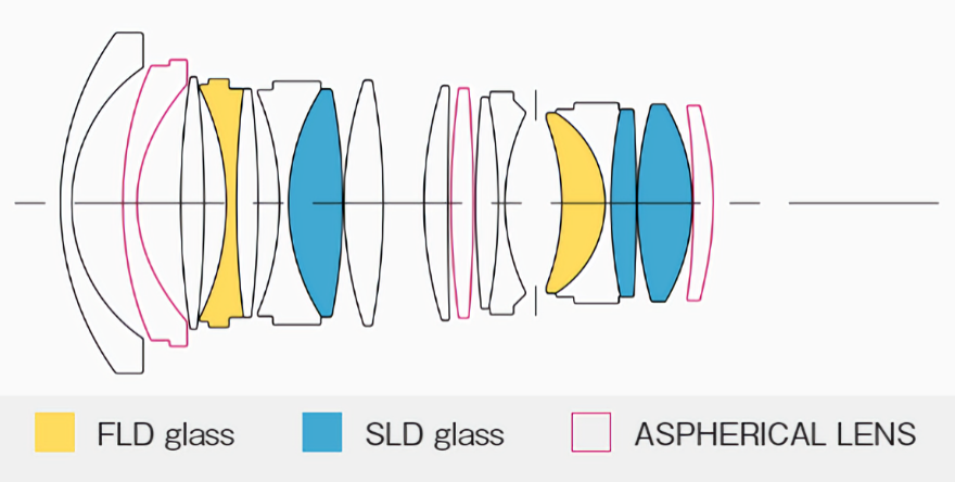 Das Objektiv ist mit zwei FLD-Glaselementen («F» Low Dispersion) und drei SLD-Glaselementen (Special Low Dispersion) ausgestattet. Diese drei effizient arrangierten asphärischen Linsen, inklusive einer asphärischen Linse mit grossem Durchmesser, sorgen für eine gründliche Korrektur der chromatischen Aberration, die insbesondere bei Weitwinkel-Objektiven zu finden ist. Dadurch wird eine hohe Auflösung über den gesamten Sensor ermöglicht, während sagittale Koma vollständig korrigiert und Verzeichnung ebenso effektiv reduziert werden. Sowohl bei der Streetfotografie als auch bei Aufnahmen von Landschaften und Nachthimmel wird eine aussergewöhnliche Leistung erzielt.
