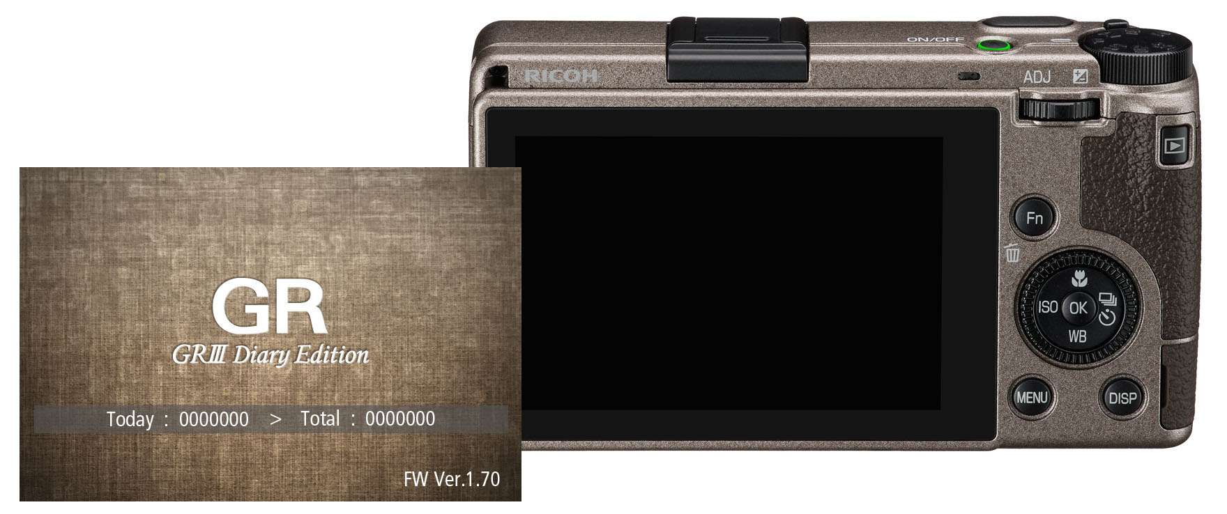 Erweiterte Abschaltgrafik: Die Abschalt-Bildschirmgrafik ist in Anlehnung an das Gehäusedesign gestaltet, und zeigt ein geprägtes Logo vor einer Textur und Farbgebung, in Anlehnung an die Oberfläche des Gehäuses. Als neue Funktion, die ebenfalls für die existierenden GR III und GR IIIx Modelle per Firmware-Updates verfügbar sein werden, bietet die Abschaltgrafik zusätzliche Informationen. Neben dem aktuellen Tages-Bildzähler, wird jetzt die Gesamtbildzahl, sowie die Firmware Versionsnummer angezeigt.