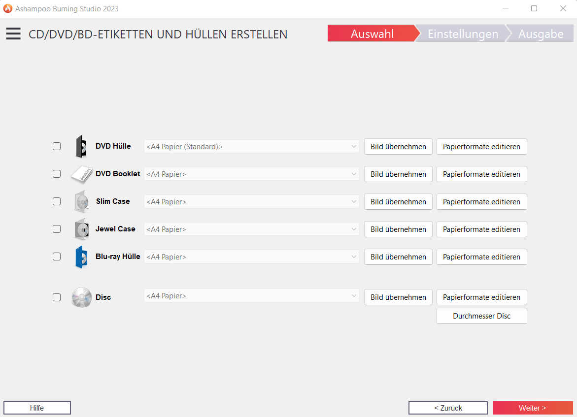 Ashampoo Burning Studio 2023 bietet einen speziellen Menüpunkt, der auf komfortable Weise das Erstellen von Covern und Hüllen ermöglicht.