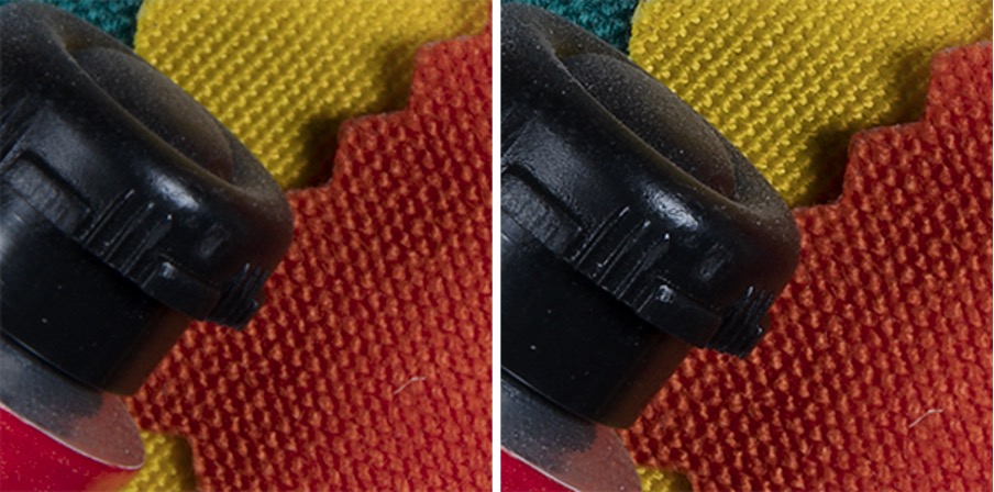 Bildkanten nach erfolgtem Nachschärfen in Adobe Lightroom® (links) und mit den optischen DxO-Modulen (rechts). Im Gegensatz zu Adobe Lightroom sind die optischen DxO-Module in der Lage, die erforderlichen Korrekturen von der Bildmitte aus nach Bedarf zu erhöhen, wodurch ein schärferes Gesamtbild erzielt wird.