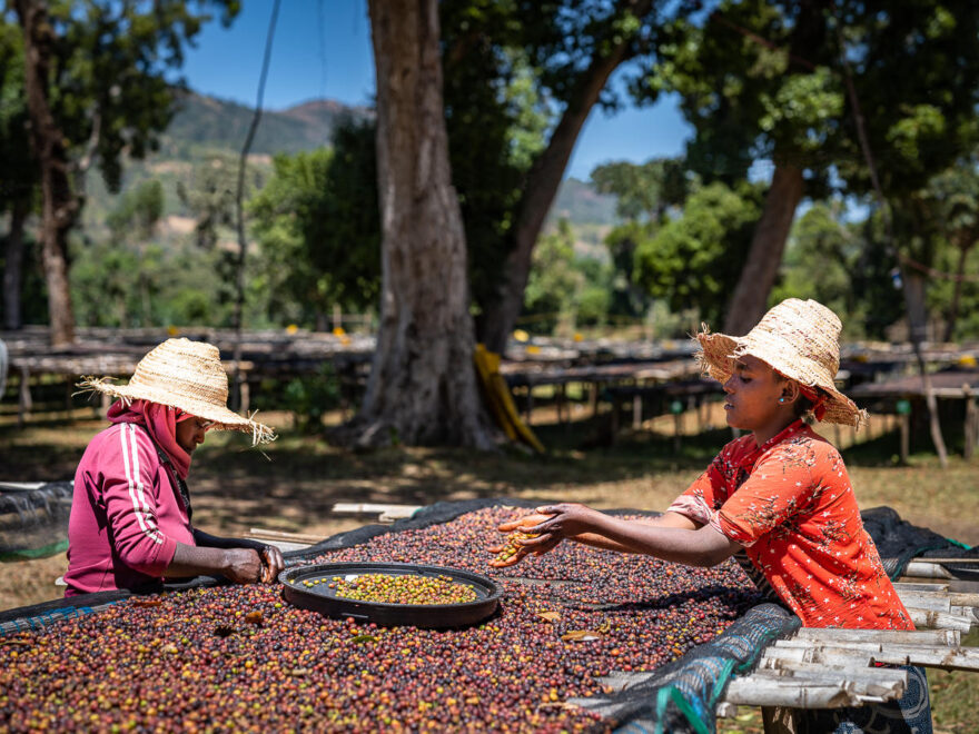 Weil aufgrund der Klimaerwärmung in den letzten Jahren die Pflücksaison im Erntezyklus immer früher beginnt, kommen wir zu dieser Jahreszeit auch bei der nächsten Washing-Station zu spät. Wir treffen aber noch auf letzte Sortierarbeiten beim Sonnentrocknen der «Natural» aufbereiteten Kaffeekirschen und sehen, wie mit Sorgfalt über- und unreife Kirschen ausgelesen werden.