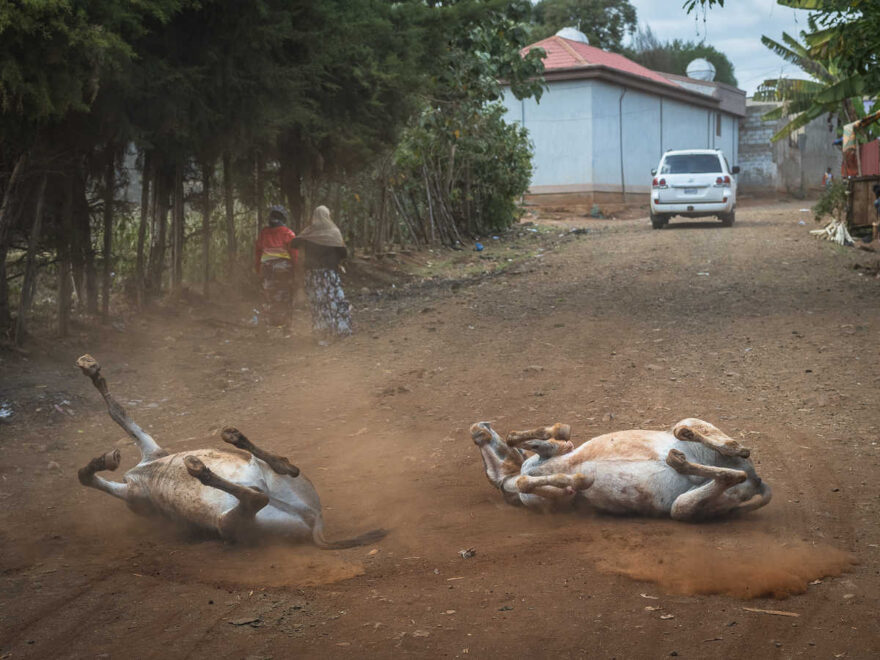 Die beiden Esel sind weder umgestürzt noch krank. Nein, sie suhlen sich genüsslich auf dem rauen, sandigen Boden, um sich möglichen Parasiten zu entledigen