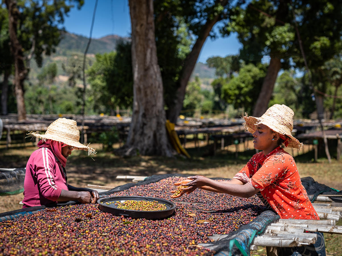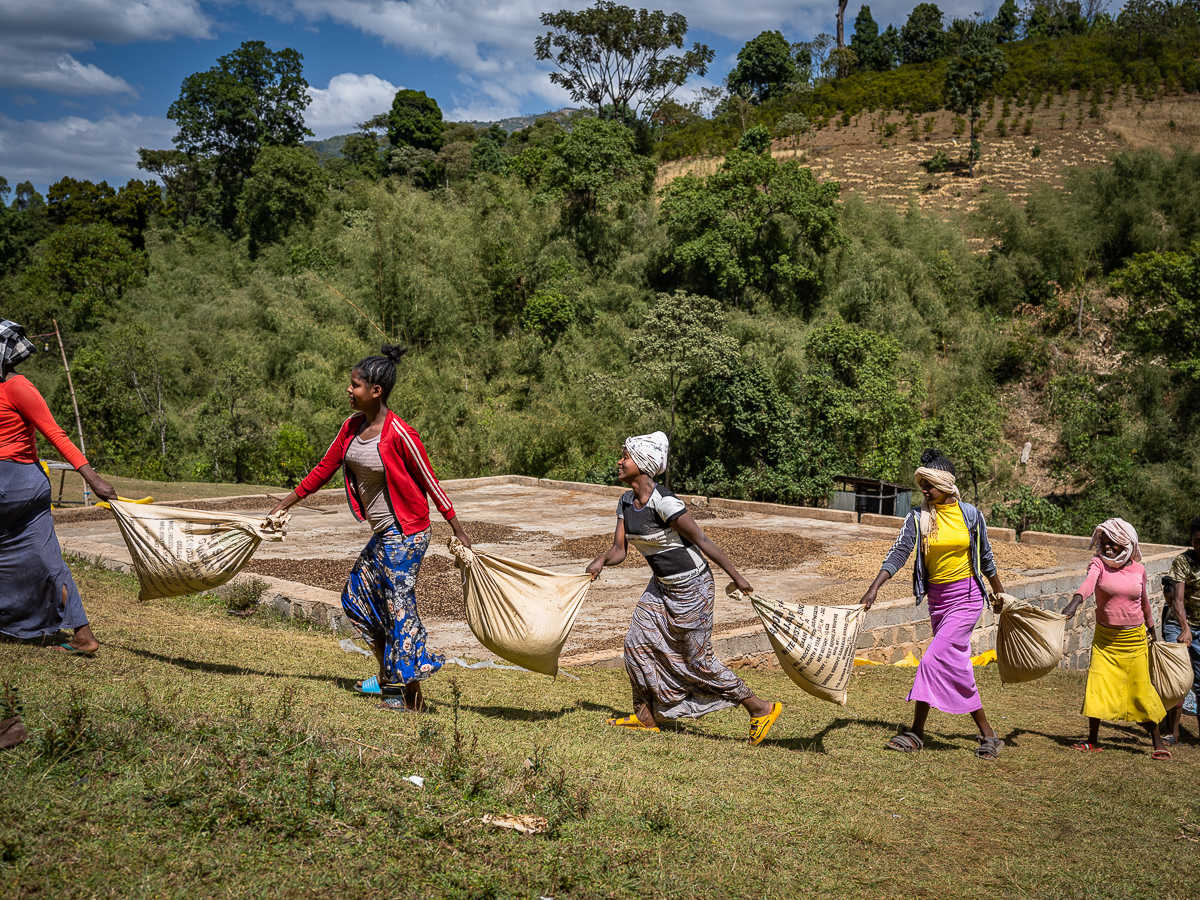 Weil aufgrund der Klimaerwärmung in den letzten Jahren die Pflücksaison im Erntezyklus immer früher beginnt, kommen wir zu dieser Jahreszeit auch bei der nächsten Washing-Station zu spät. Wir treffen aber noch auf letzte Sortierarbeiten beim Sonnentrocknen der «Natural» aufbereiteten Kaffeekirschen und sehen, wie mit Sorgfalt über- und unreife Kirschen ausgelesen werden.