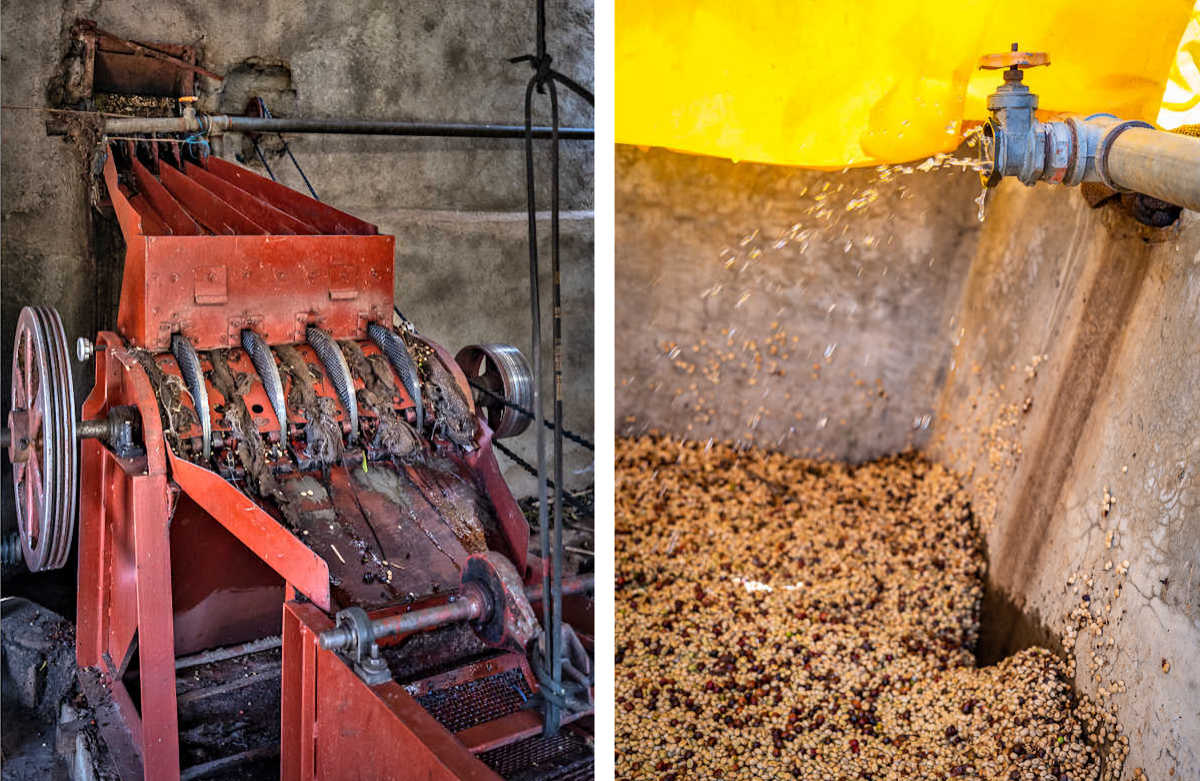 In der Pulping-Maschine werden die gepflückten Kaffeekirschen gequetscht, damit sich das Fruchtfleisch von den beiden Kernenhälften trennt. Danach werden die Bohnen in einem Betonbecken mit Frischwasser gesprenkelt, um den mehrstündigen Gärungsprozess in Gang zu setzen
