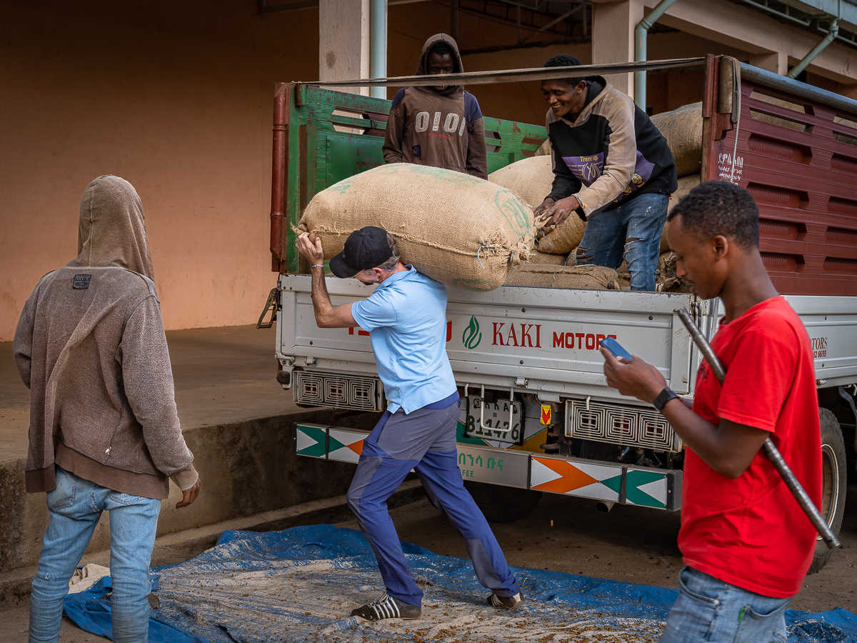 Sieht locker aus, wie Patrik einen Kaffeesack ins Lager trägt