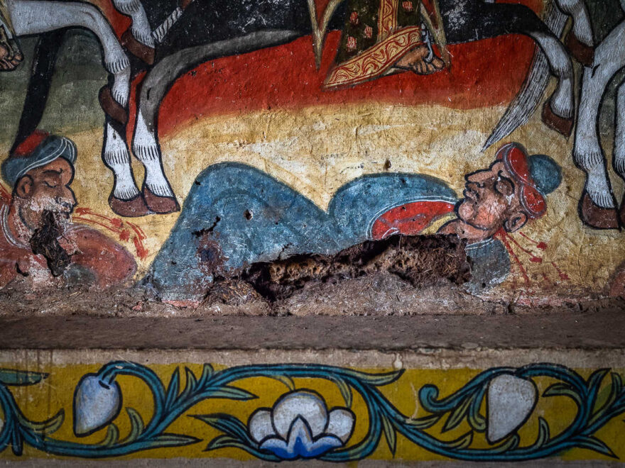 Im Innern der Kirche stossen wir auf eine Rundlaube. An der Innenwand sieht man riesige religiöse Wandbilder, welche meistens biblische Ausschnitte zeigen. Unterhalb der Bildnisse liegen auch sakrale Gegenstände. Im Halbdunkel sehen wir Trommeln und auch uralte Rasseln, die in Zeremonien der Äthiopisch-Orthodoxen Tewahedo-Kirche eine wichtige Bedeutung haben.