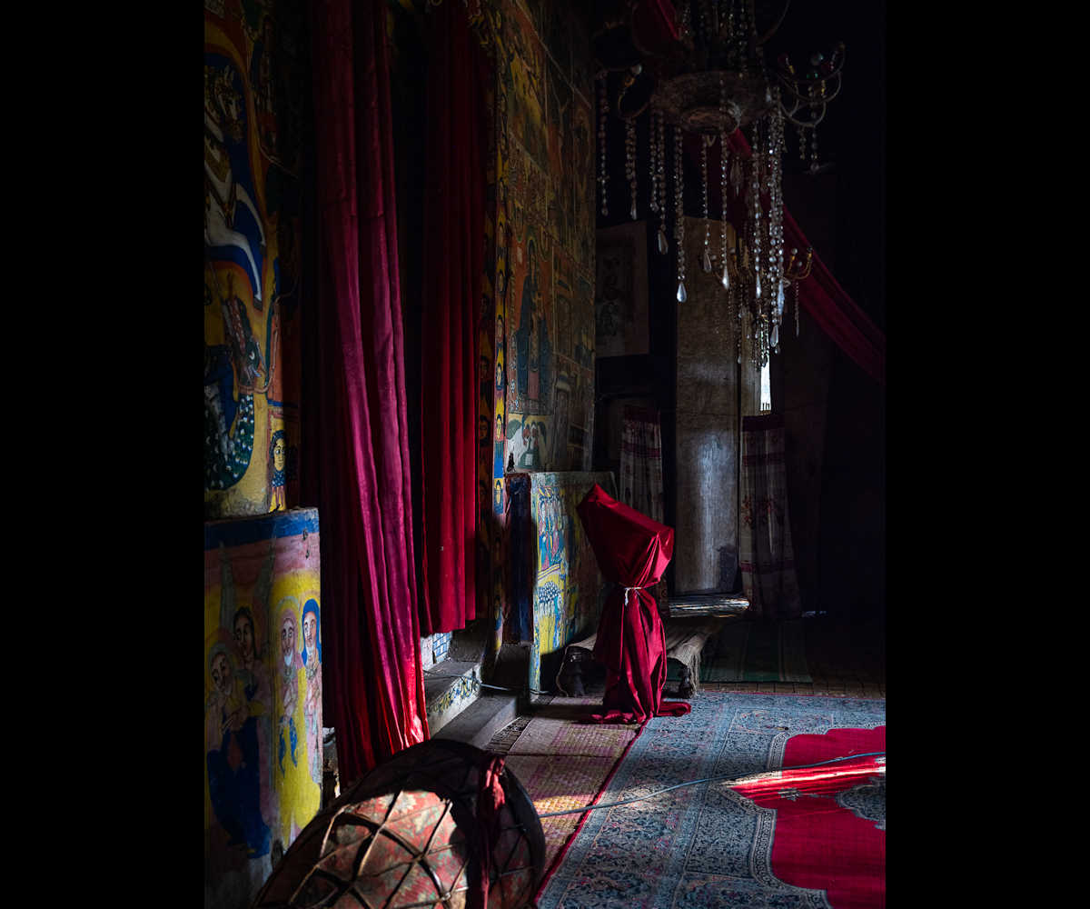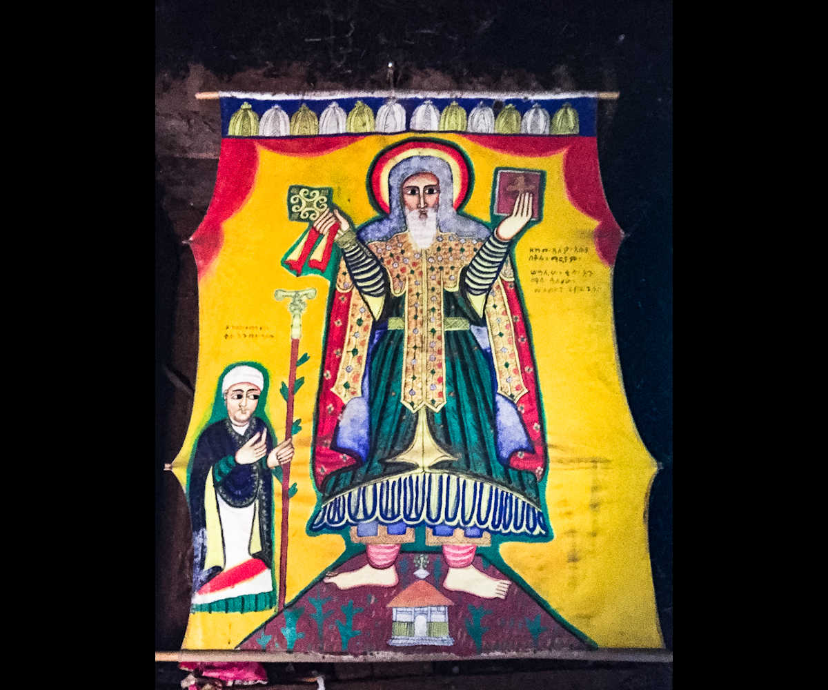 Im Innern der Kirche stossen wir auf eine Rundlaube. An der Innenwand sieht man riesige religiöse Wandbilder, welche meistens biblische Ausschnitte zeigen. Unterhalb der Bildnisse liegen auch sakrale Gegenstände. Im Halbdunkel sehen wir Trommeln und auch uralte Rasseln, die in Zeremonien der Äthiopisch-Orthodoxen Tewahedo-Kirche eine wichtige Bedeutung haben.