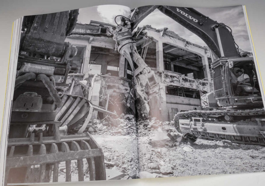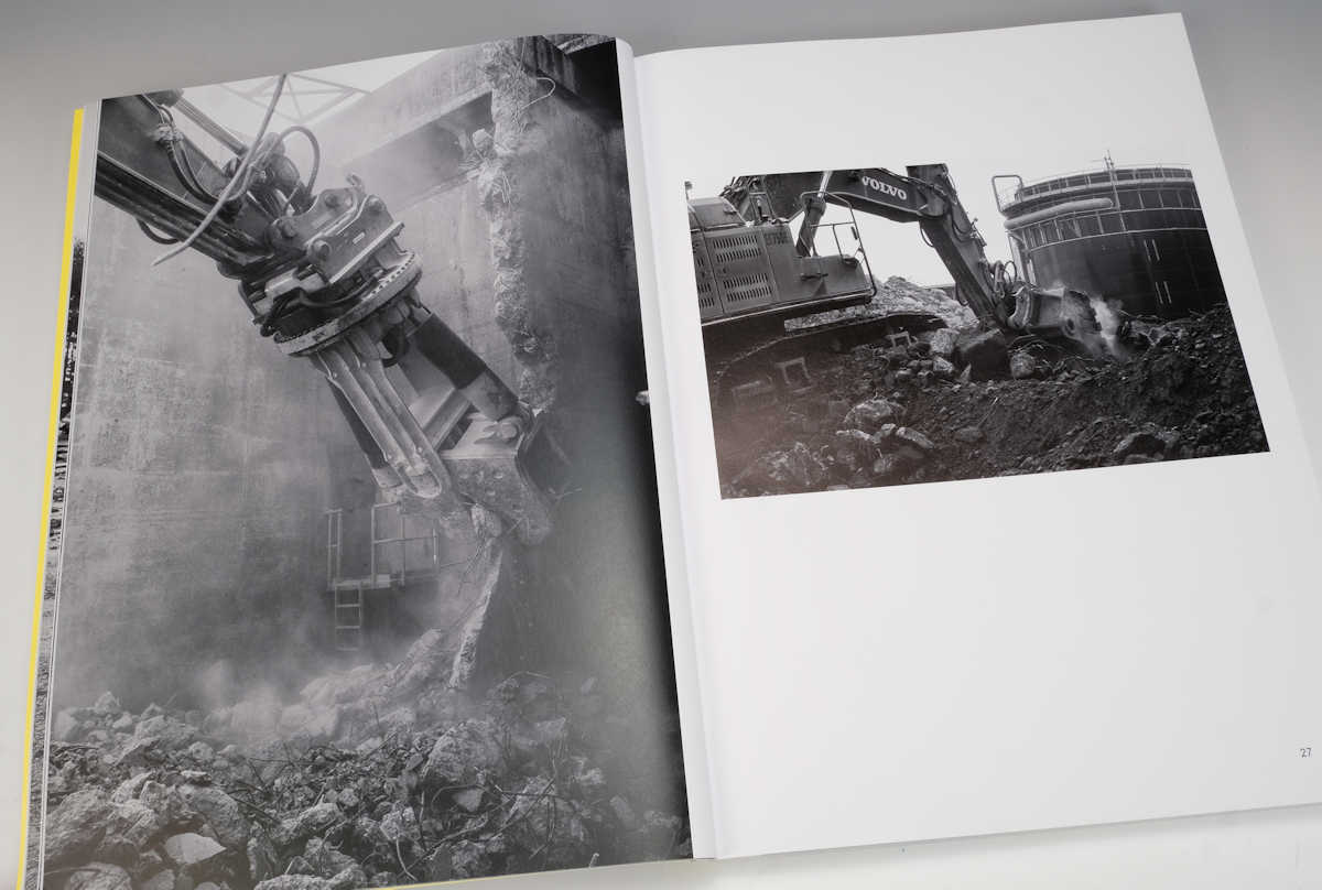 Was einst zum Stolz der Schweiz gehörte, soll in seiner letzten Phase nochmals dokumentiert werden – so das Leitmotiv für ein gewaltiges Fotoprojekt von Hand Hofmann, der danach jede Woche mindestens einen Tag in Utzenstorf verbringt. Mit seiner Leica Monochrom verfolgt er alle entscheidenden Phasen des Rückbaus, setzt jene Bagger und Bulldozer wirkungsvoll ins Bild, welche die Betonstrukturen einreissen, den Schutt abtransportieren – und auch der Beton-Beisser kommt mit aufs Bild, der sich heisshungrig durch die Armierungseisen frisst.