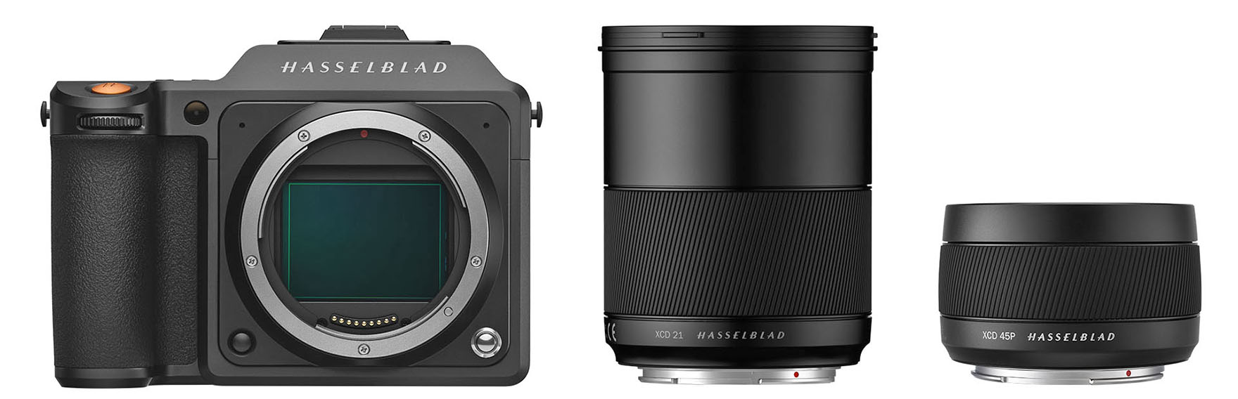 Das «X2D 100C Lightweight Field Kit» besteht aus dem Kameragehäuse X2D 100C (mit 100 Mpx) und den Weitwinkel-Objektiven XCD 4/21 (KB: 17mm) und XCD 4/45P (KB: 36mm).