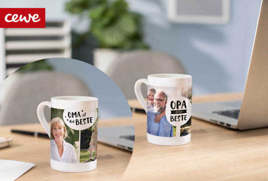 Mit einer individuellen Fototasse hält man Erinnerungen an gemeinsame Erlebnisse auf kreative Weise warm. Den ersten Kaffee oder Tee des Tages geniesst die Ehrenperson aus ihrer neuen Lieblingstasse. Mit dem Lieblingsmotiv der Enkelkinder darauf, wird die Tasse jeden Morgen für ein Lächeln sorgen. Ein individueller Spruch oder Wunsch machen sie noch einzigartiger und bereiten garantiert Freude für die besten Mamis und Papis.