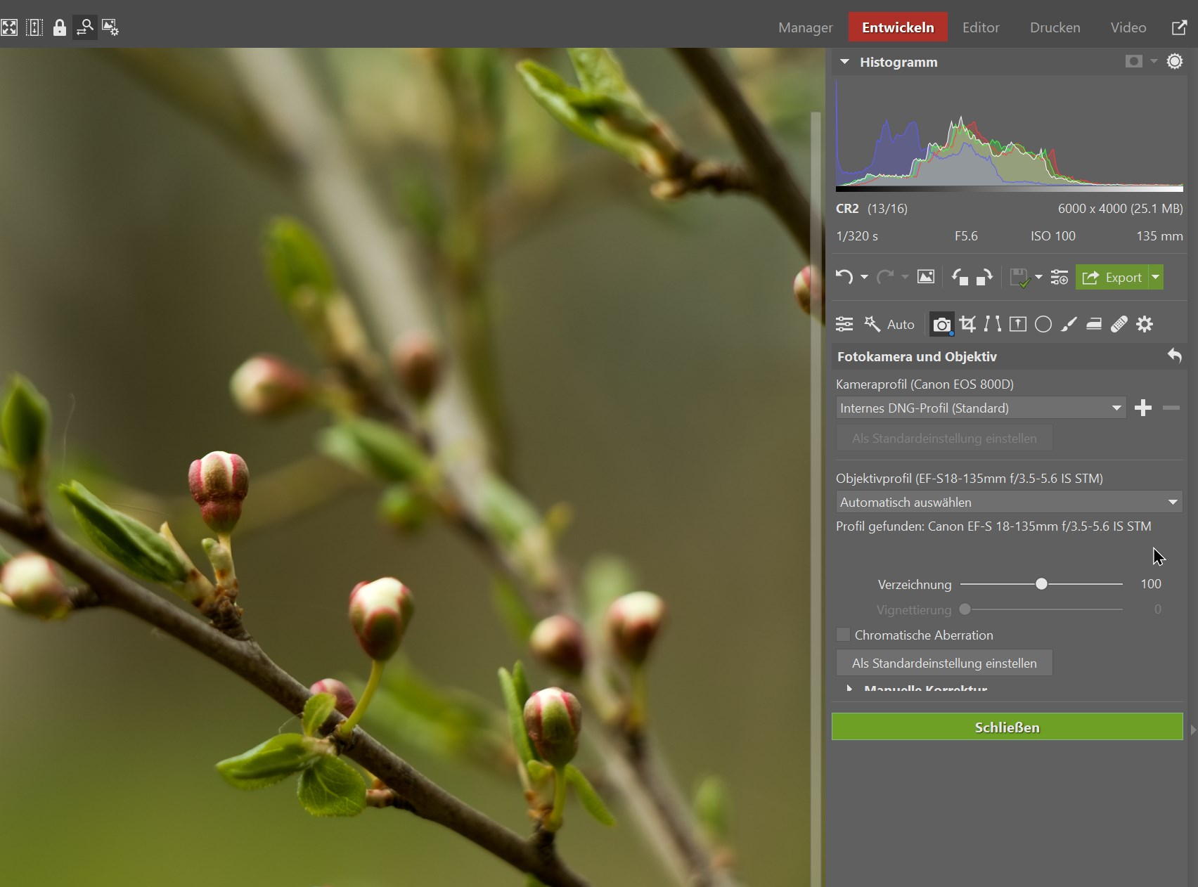 Zoner Photo Studio X korrigiert jetzt auch Verzerrungen, Farbabweichungen und Vignettierung bei den gängigsten Objektiven, ohne dass zusätzliches Zubehör installiert werden muss. Die Funktion zur Korrektur von Objektiv-bedingten Abbildungsfehlern soll zukünftig weiter ausgebaut werden. Die Objektivauswahl oder das Aktivieren automatischer Korrekturen finden Benutzer im Abschnitt «Objektiv» des Moduls «Entwickeln».