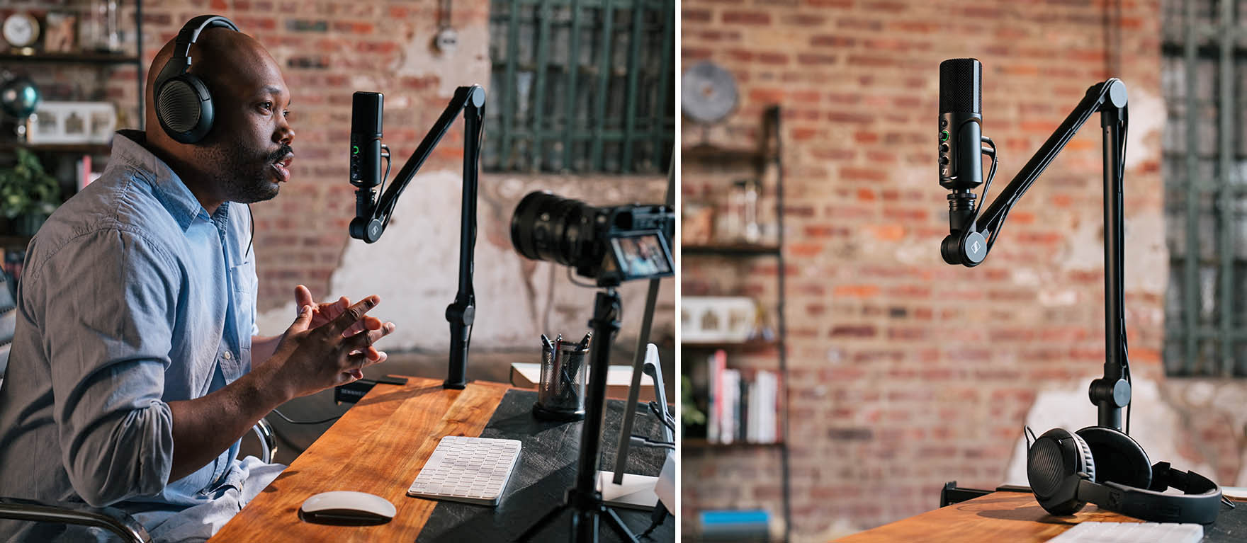 Das Profile USB-Mikrofon kann bequem positioniert und bewegt werden, während das flexible Gelenk dafür sorgt, dass das Mikrofon in der gewünschten Position verbleibt. Die 3/8- und 5/8-Zoll-Anschlüsse an der Unterseite erlauben die Befestigung auf Tischstativen und an Halterm anderer Hersteller. Für Streamer, Podcaster usw., die komplexere Positionierungen bevorzugen, lohnt sich das Profile Streaming Set, das mit einen selbstfixierenden 3-Punkt-Gelenkarm (Boom) geliefert wird. Mit seinem schlanken und modernen Design, das auch das Kabelmanagement unterstützt, eignet sich das Profile Streaming Set vor allem für Streaming-Inhalte, auf denen das Mikrofon zu sehen ist.