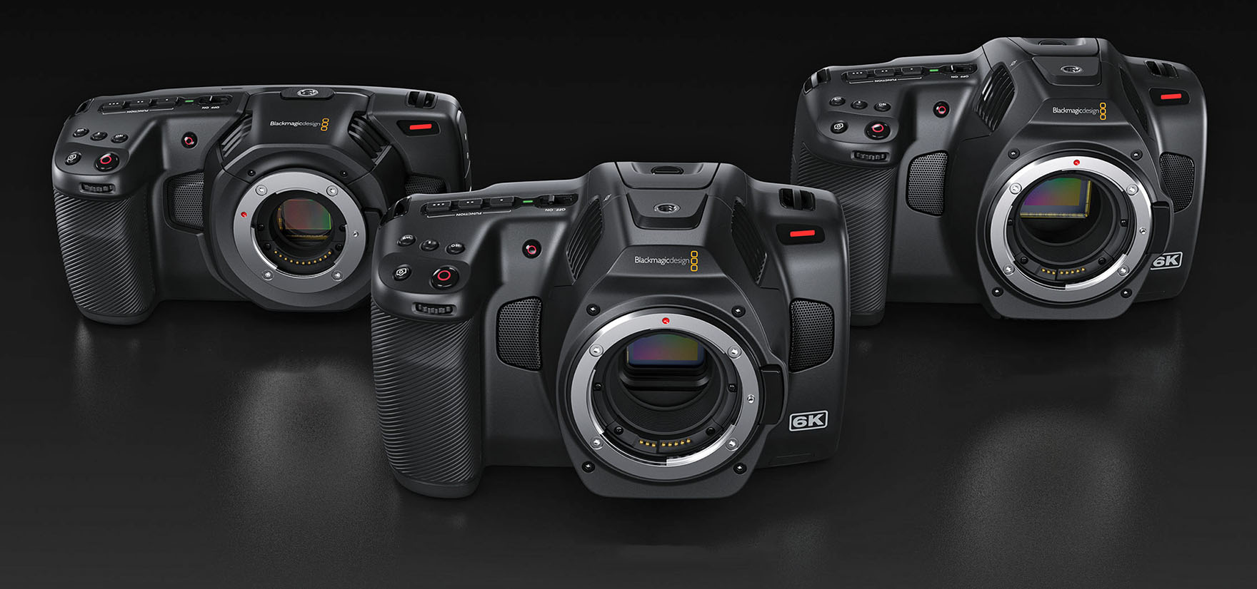 Die drei aktuellen «Blackmagic Pocket Cinema Camera»-Modelle (PCCs): Links ist die PPC 4K mit 4K-Bildsensor im FourThirds-Format und rechts die PPC 6K G2 (zweite Generation) mit 6K-Sensor im Super35-Format abgebildet, während vorne in der Mitte die PCC 6K Pro (erste Generation des 6K-Modells) zu sehen ist.