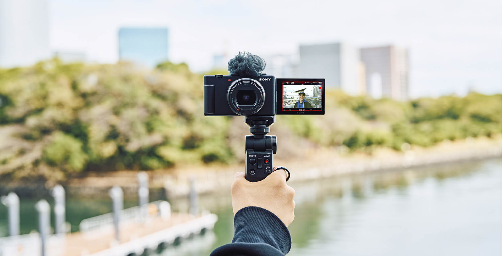 Die ZV-1 II ist ideal für unterwegs: Obwohl mit einem optischen Weitwinkelobjektiv ausgestattet, ist sie so kompakt und leicht, dass sie sich bequem in der Tasche oder einem kleinen Beutel mitnehmen lässt. Mit ihrem Selfie-freundlichen Display mit verstellbarem Winkel, dem komfortablen Griff am Gehäuse (oder dem optionalen Aufnahmegriff GP-VPT2BT), den benutzerfreundlich angeordneten Bedienelementen *11 und der Aufnahmeanzeige an der Vorderseite unterstützt die ZV-1 II unterschiedliche Aufnahmestile. Die Monitoranzeige wurde mit einem kräftigen roten Rahmen neu gestaltet, der deutlich sichtbar anzeigt, wenn eine Aufnahme läuft. Über den USB Typ-C-Anschluss lässt sich die Kamera leicht aufladen.