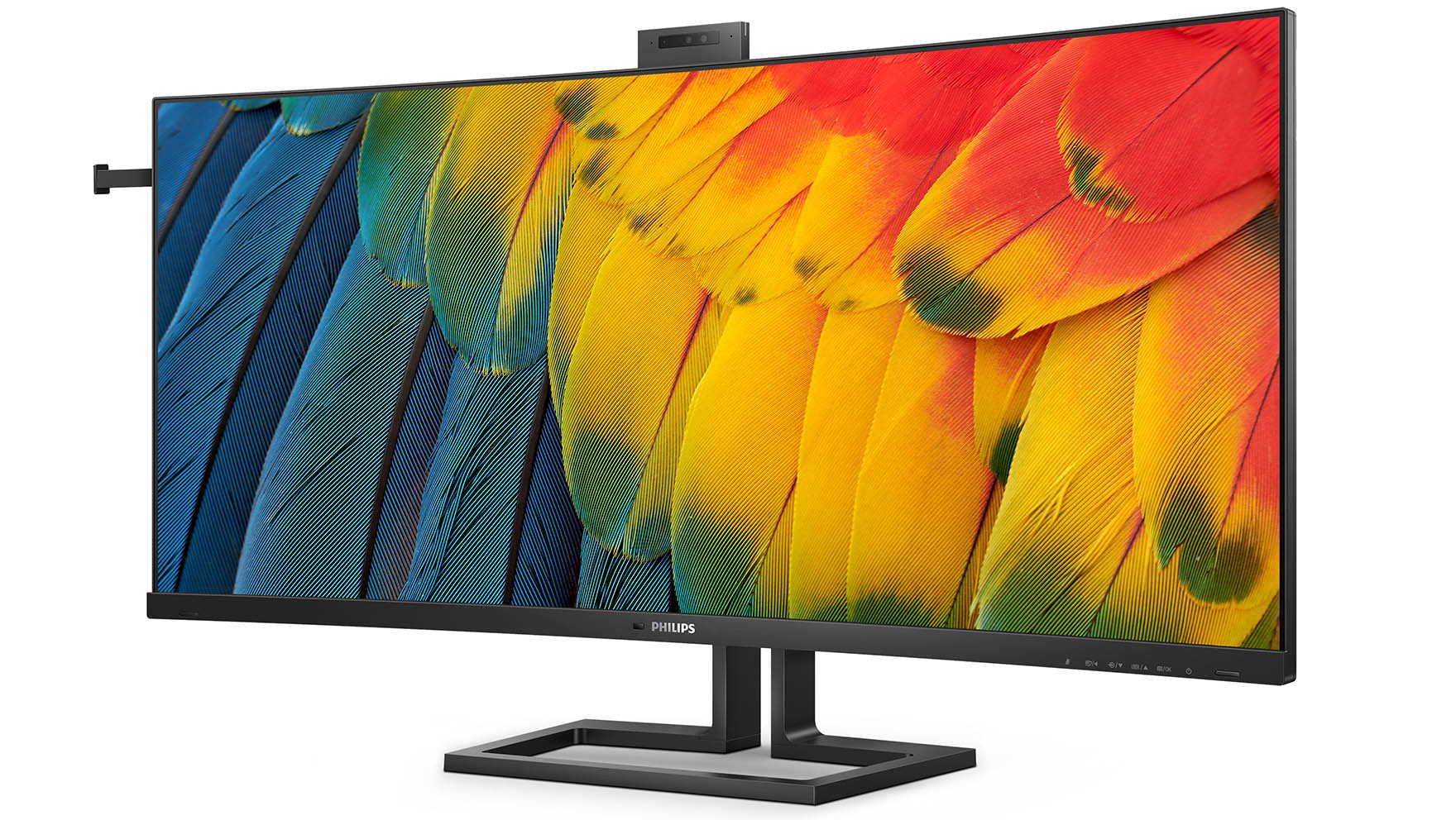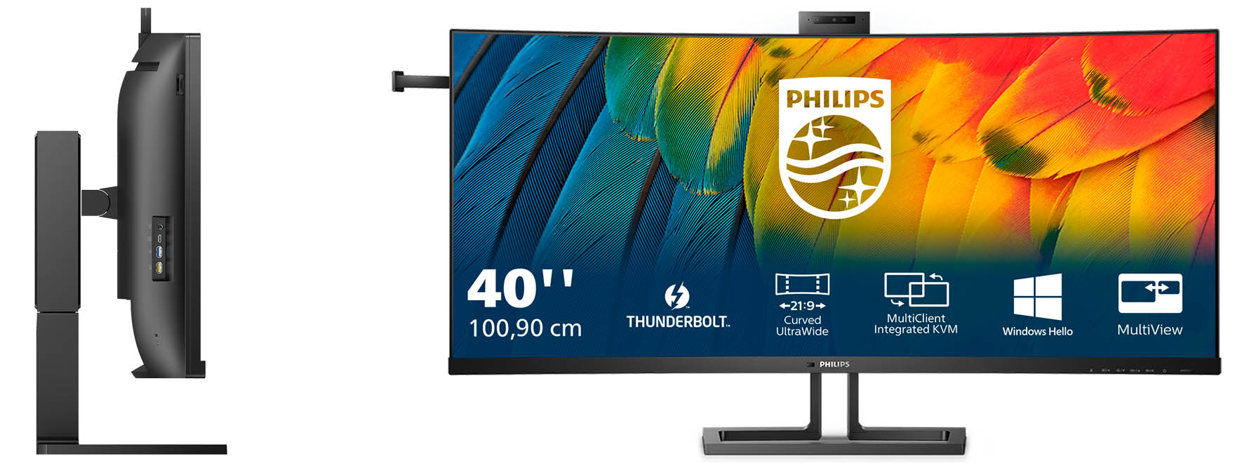 Zusätzliche Geschwindigkeit dank des Thunderbolt-4-Anschlusses des Philips 40B1U6903CH. Links ist der Bügle zum Aufhängen eines Headsets und oben die ausgefahrene Webcam zu sehen.