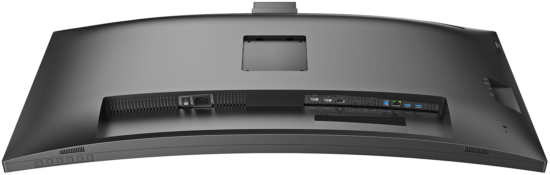 Blick von unten auf die rückseitigen Arschschlüsse. Weitere Anschlüsse (2x USB-A, USB, C, Kopfhörer) sind seitlich platziert, deren Einbuchtung hier rechts zu sehen ist.