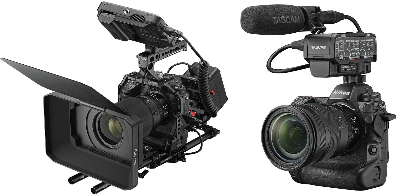 Für Videoaufnahmen gerüstete Nikon Z9: links ist sie mit 1.2/50mm auf einem Rig von Smallrig samt Fieldrecorder-Monitor von Atomos zu sehen, rechts mit 2,8/24-70mm und Tascam XLR-Adapter samt Mikro.