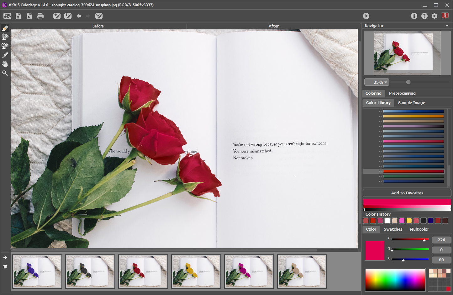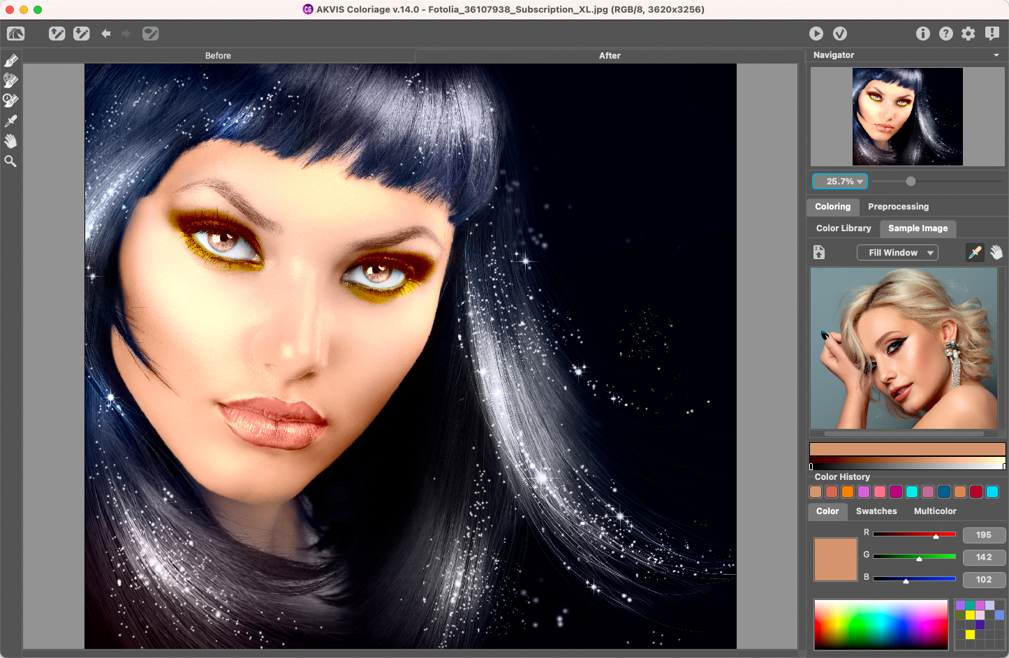 Nun ist Version 14.0 erschienen und führt neue Features ein, die die Software noch effizienter machen. So kann nun ein Musterbild zum Einfärben geladen werden. Auf der Musterbild-Registerkarte können Benutzer Farben aus einem anderen Bild auswählen. Neue Vorverarbeitungsparameter helfen dabei, ein Originalbild vor der Kolorierung zu verbessern. Benutzer können ein Farbfoto in Graustufen umwandeln sowie die Bildhelligkeit und den Kontrast anpassen.