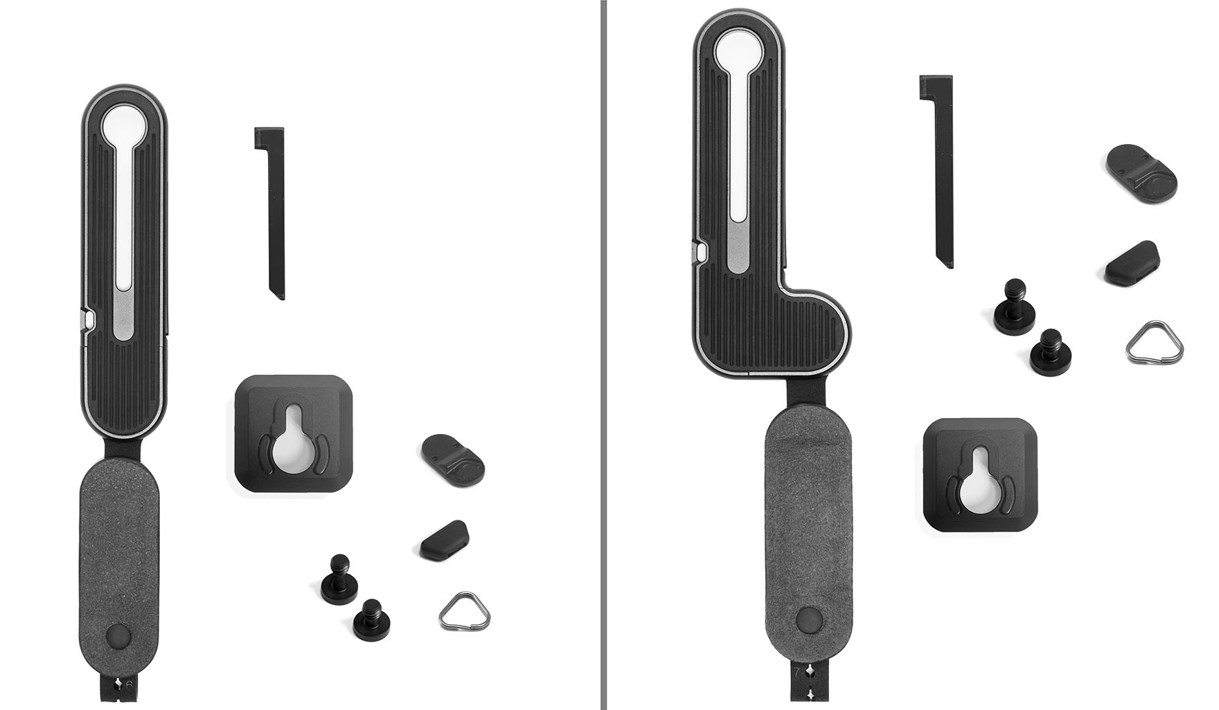 Lieferumfang Micro Clutch I-Plate (links) und L-Plate (rechts) mit Platte samt Schlaufe, dem Schraubendreher, einer Schnellwechselplatte mit Arca-Swiss-Profil, zwei Befestigungsschrauben und Kleinteilen.