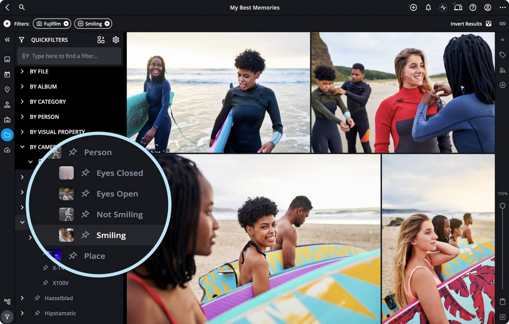 Mit neuen QuickFilters und SmartTags können Fotografen selbst riesige Fotoarchive neu sortieren und durchsuchen, denn die Software erkennt z.B. ob Augen offen ode rgeschlossen sind, porträtierte Personen. lächeln oder nicht.