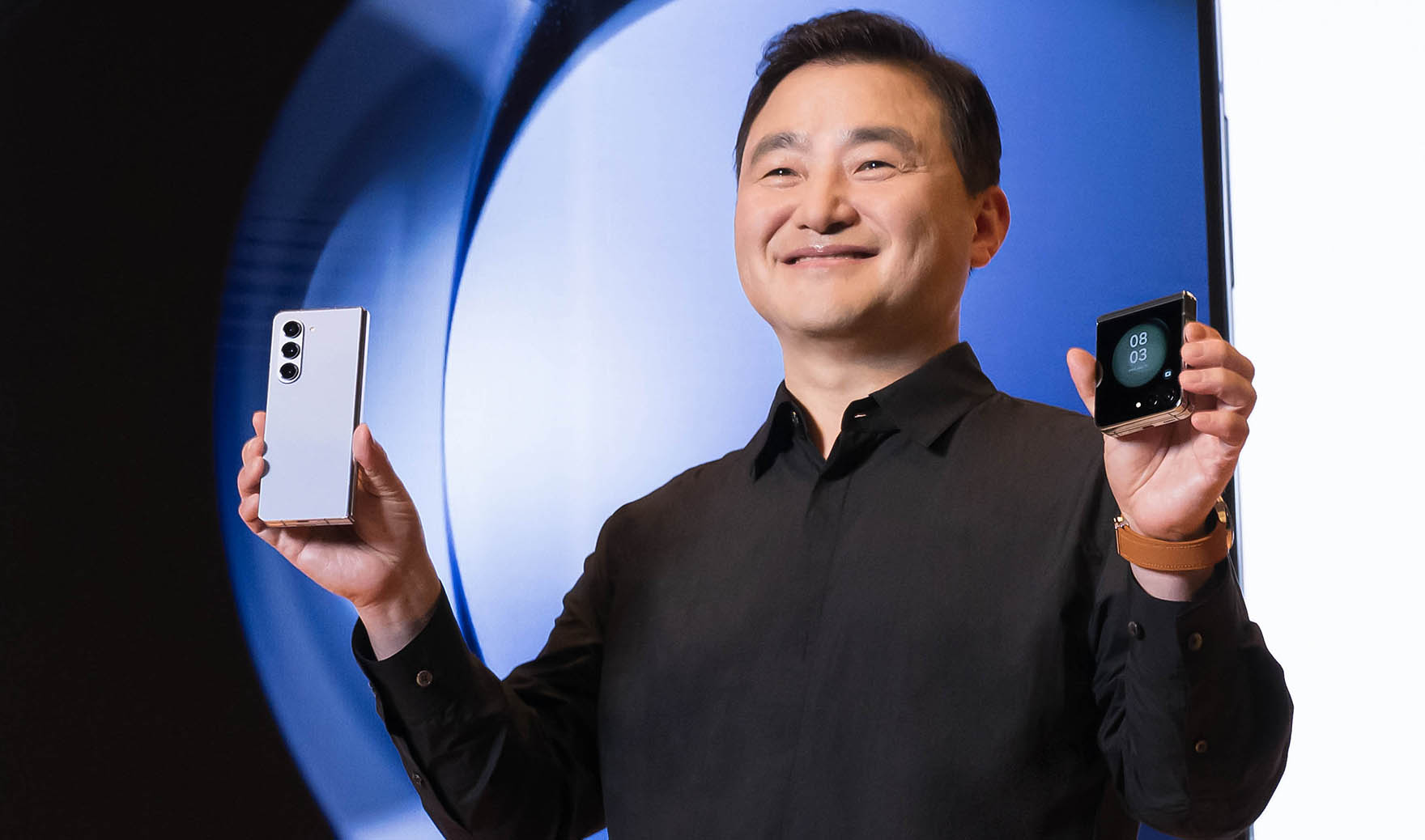 TM Roh von Samsung präsentierte die beiden neuen Smartphones mit falbaren Displays. Beide sind hier zusammengefaltet bzw. -geklappt. In der rechten Hand (links im Bild) hält er das Fold5, in seiner linken Hand (rechts) das Flip5.