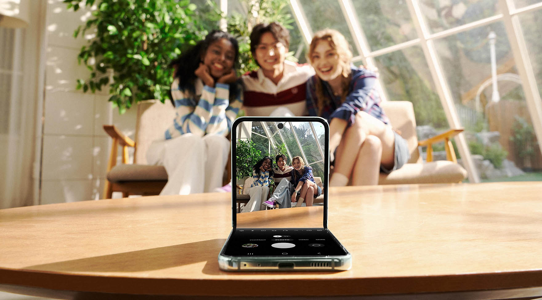 Mit seinem unvergleichlichen Design bietet das Galaxy Z Flip5 auch ein vielseitiges Kameraerlebnis. Das grössere Cover Display ermöglicht über die Rückkamera einerseits hochwertige Selfies und über die FlexCam atemberaubende Fotos aus kreativen Blickwinkeln. Auch das Bearbeiten von Aufnahmen im Flex Mode⁸ ist schnell und einfach: Die Schnellansicht im Flex-Fenster ermöglicht es, die Bilder zu überprüfen, den Farbton anzupassen oder diese zu löschen. Wird ein Foto von einer befreundeten Person gemacht, kann diese sich dank Dual Preview⁹ selbst im Cover Display sehen, sodass sie in Echtzeit Anpassungen für die perfekte Aufnahme vornehmen kann. Mit der Kamera-Stabilisierungsfunktion Super Steady gelingen ruhige Aufnahmen auch unterwegs, während der automatische Bildausschnitt¹⁰ dafür sorgt, dass niemand übersehen wird.