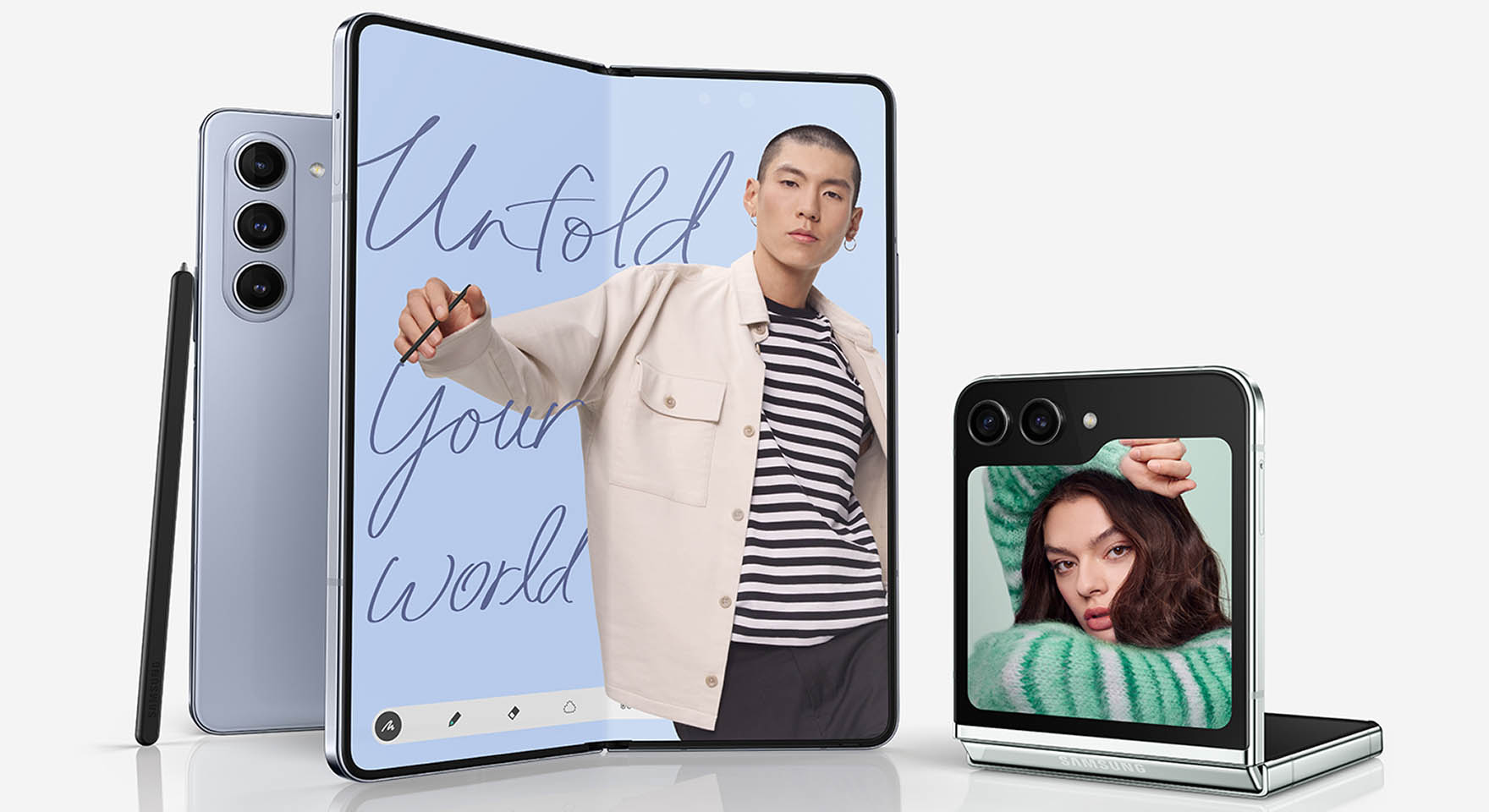 Samsung Electronics hat die bereits fünfte Generation der Galaxy Foldables angekündigt: Ganz links ist die Rückseite des Fold5 mit optionalem «S Pen» und in der Mitte das Innendisplay des auseinandergefalteten Fold5 zu sehen. Rechts ist das halb aufgeklappte Flip5 mit seinem Cover-Display und der rückseitigen 2fachen Kamera zu sehen.