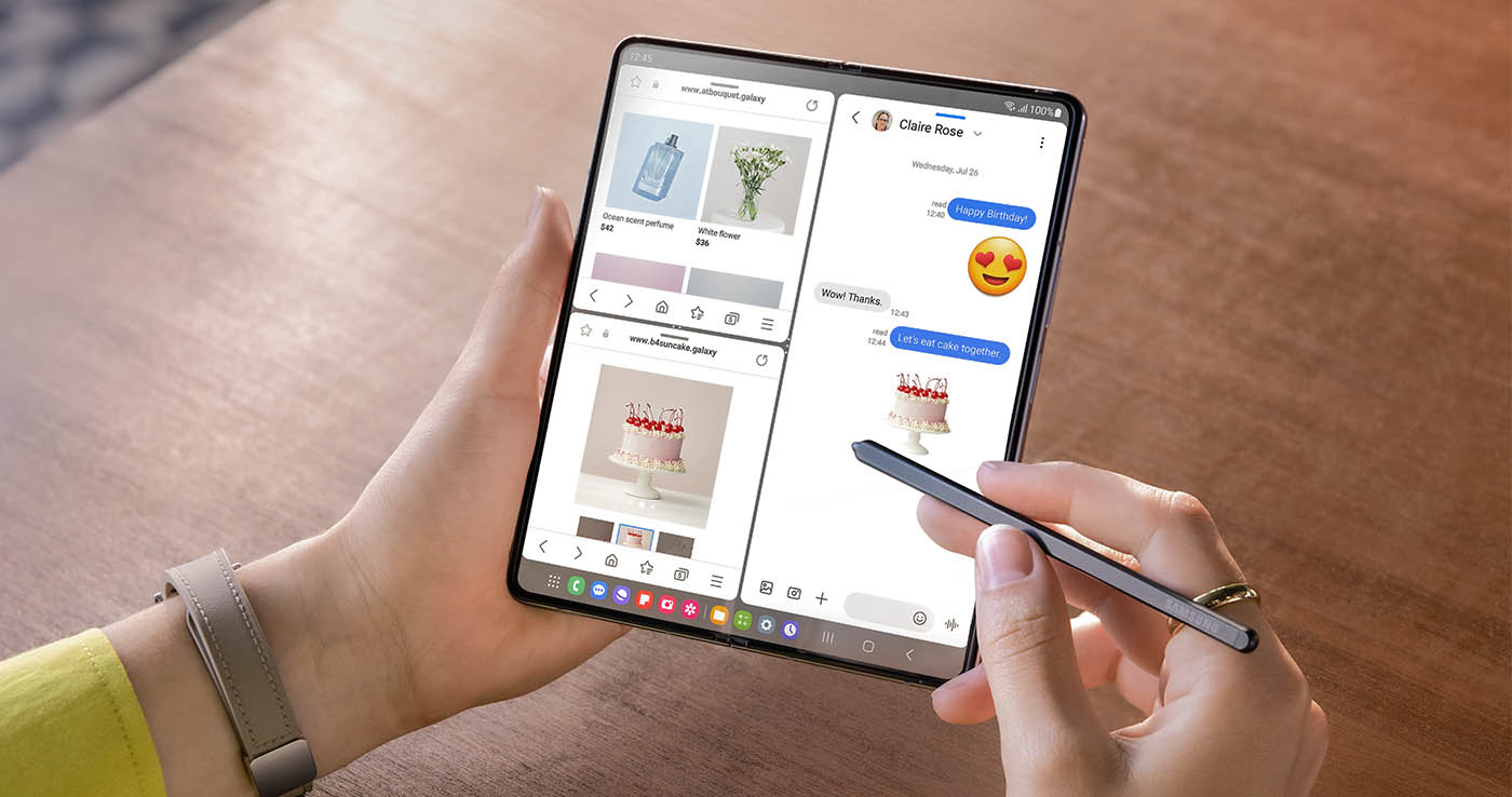 Die verbesserte Taskleiste erleichtert dynamisches Arbeiten, da schnell zwischen häufig verwendeten Anwendungen gewechselt werden kann: So stehen bis zu vier Apps zur Verfügung. Das verbesserte Two-handed Drag & Drop¹⁷ kann die Produktivität beim Verschieben von Inhalten zwischen Apps und Bildschirmen ebenfalls steigern. Nutzerinnen und Nutzer können dabei mit einem Finger ein Bild in der Samsung Gallery berühren und halten, während sich parallel mit einem anderen Finger die App Samsung-Notes öffnen lässt, um das Bild so einfach per Drag & Drop zu verschieben. Mit dem Hidden Pop-Up¹⁸ kann zudem eine App im Hintergrund weiterlaufen, während Nutzerinnen und Nutzer Videoinhalte im Vollbildmodus ansehen und mit Freundinnen und Freunden in einem Pop-Up am Bildschirmrand chatten.