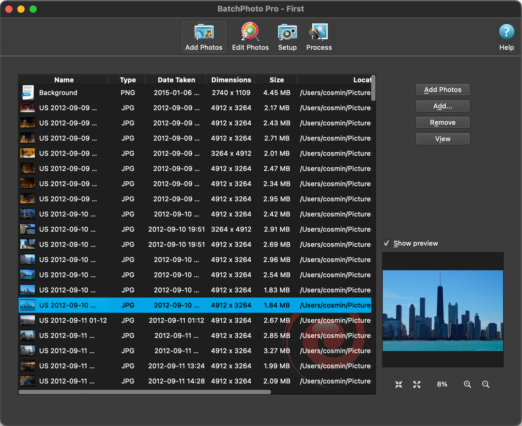 BatchPhoto wurde entwickelt, um die Produktivität von Fotoschaffenden (Fotoprofis, Bildbearbeiter, Hobbyfotografen) zu steigern. Die Software kann deshalb eine Vielzahl von Bildbearbeitungs-Vorgängen automatisieren, um viele Fotos zusammen in einem Rutsch zu optimieren und für einen Verwendungszweck aufzubereiten. Man kann unter anderem die Grösse von Bildern ändern, Fotos zuschneiden, sie drehen und in verschiedene Formate konvertieren. Gleichzeitig kann man die Helligkeit, den Kontrast und die Farben verbessern, künstlerische Effekte anwenden oder Rahmen hinzufügen.