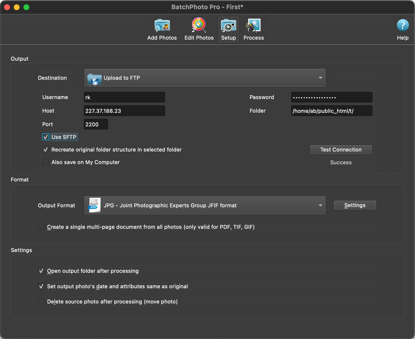 Die «Hot Folders»-Funktion von BatchPhoto erlaubt, indem SFTP sowohl als Quelle für das Herunterladen von Bildern als auch als Ziel für das Hochladen der verarbeiteten Bilder hinzugefügt wurde.