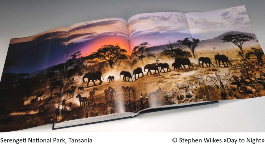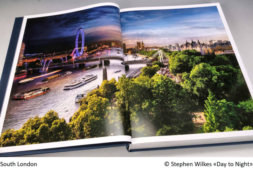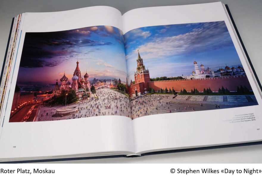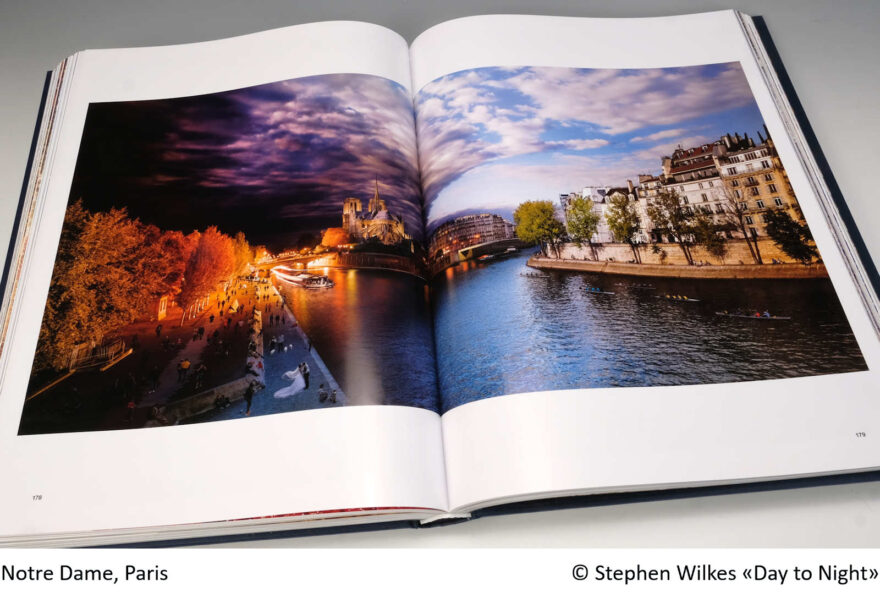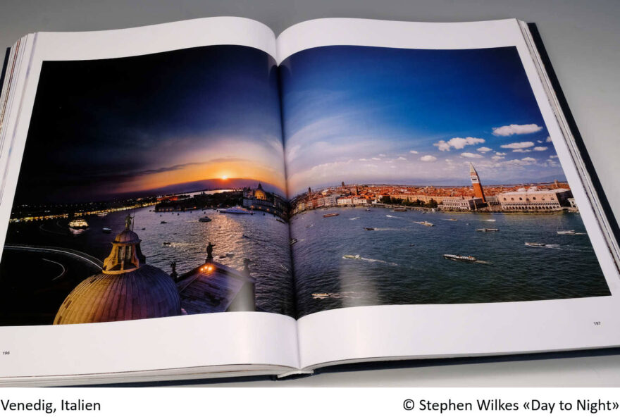 Ja, natürlich Photoshop! wird wohl die häufigste Reaktion jener sein, welche die Bilder in diesem Buch zum ersten Mal betrachten. Ein Bild am Tag und eines nachts und dann zusammenmechen … Aber so einfach macht sich Stephen Wilkens seine Aufgabe nicht. Er fotografiert ein Objekt während mehreren Stunden, von frühmorgens bis spätabends, und setzt die mehreren Hundert oder mehr als Tausend Einzelbilder zu einer riesigen Komposition zusammen. Dabei werden Personen und Details eingefügt, die Schatten der Lichtrichtung angepasst und alle Übergänge, von Hell zu Dunkel, akribisch bearbeitet, bis das letzte Detail stimmt. Wilkens arbeitet mehrere Monate an einem Bild, nimmt sich immer wieder das eine oder andere Detail vor, um es noch perfekter zu machen. Weiss man, welcher Aufwand hinter diesen Werken steckt, so beginnt man genauer hinzuschauen, sucht nach Details, die eingesetzt oder bearbeitet sind. Es ist alles so perfekt, dass man der Arbeit von Stephens Wilkens mit grossem Respekt begegnet. Kommt noch hinzu, dass Wilkens mit seinen ersten Arbeiten 2009 begann, zu einer Zeit also, als die digitale Bildbearbeitung bei weitem nicht die Möglichkeiten bot, an die wir heute denken – von KI ganz zu schweigen.