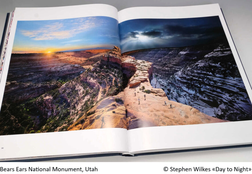 «Day to Night» – der Titel sagt es – verblüfft vor allem durch die wechselnden Licht- und Beleuchtungsverhältnisse, welche partiell den Übergang vom Tag zur Nacht zeigen. Das hat man in dieser Art noch kaum gesehen, vor allem nicht in dieser Perfektion und Konsequenz. Ein ausserordentlicher Effekt, der dem Titel von Lyle Rexer’s Einleitungstext – den es im Buch auf Englisch Deutsch und Französisch in voller Länge gibt – Recht: «Die ausgedehnte Zeit»! Wilkens zeigt uns nicht nur die verschiedenen Lichtstimmungen in einem Bild, sondern er dehnt damit die Zeit im Bild aus. Ein besonders deutliches Beispiel dafür ist das Bild «Bears Ears Natoinal Monument» (in der untenstehenden Inhaltsübersicht), welches rechts eine Sonnenstimmung und links den Sonnenuntergang zeigt.
