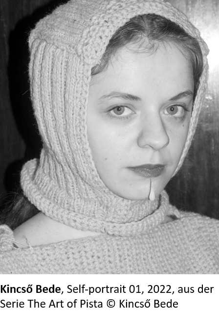 Die Künstlerin Kincső Bede (*1995) wuchs als Rumänin mit ungarischen Wurzeln in einer kleinen Stadt in Siebenbürgen, Rumänien, auf. In ihren Arbeiten befasst sie sich mit der kommunistischen Vergangenheit ihres Heimatlandes und dem Erbe von Nicolae Ceaușescu, dem ehemaligen Staatsoberhaupt Rumäniens und Führer der kommunistischen Partei des Landes. Dabei interessiert sie sich insbesondere für die Kontrollmechanismen, die zur Zeit der sozialistischen Regimes durch die Geheimpolizei Securitate etabliert wurden, und wie diese nachfolgenden Generationen bis heute beeinflussen. In den düsteren und doch humorvollen Schwarz-Weiss-Fotografien Bedes, die von der Gothic-Ästhetik inspiriert sind, scheint der morbide Geist der Zeit des Eisernen Vorhangs herumzuspuken und die Betrachter/innen heimzusuchen.