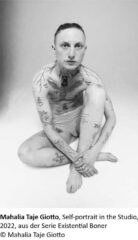Als non-binäre trans Person inszeniert Mahalia Taje Giotto (*1992) den eigenen Körper und stellt – teils verfremdete – Abbildungen dieses Körpers Tagebucheinträgen, Texten oder Archivmaterial gegenüber. Die so entstehenden intimen post-fotografischen Arbeiten, mit denen Giotto ein Zeugnis der Existenz von trans Personen schaffen und auf deren Lebensrealität aufmerksam machen will, rücken Fragen zu Identität und Sexualität ins Zentrum und hinterfragen die binären, heteronormativen Strukturen unseres patriarchalen Gesellschaftssystems. Mit der fortlaufenden Werkserie No Tears, Just Dreams veranschaulicht Giotto die Strategien, die trans Personen anwenden, um sich in diesem System durchzuschlagen. Das Projekt umfasst mehr als 200 mit Schlagworten und Satzteilen versehene Bilder, die Giotto selbst als Logbuch erlebter Traumata und gleichzeitig als Überlebenshilfe dienen.