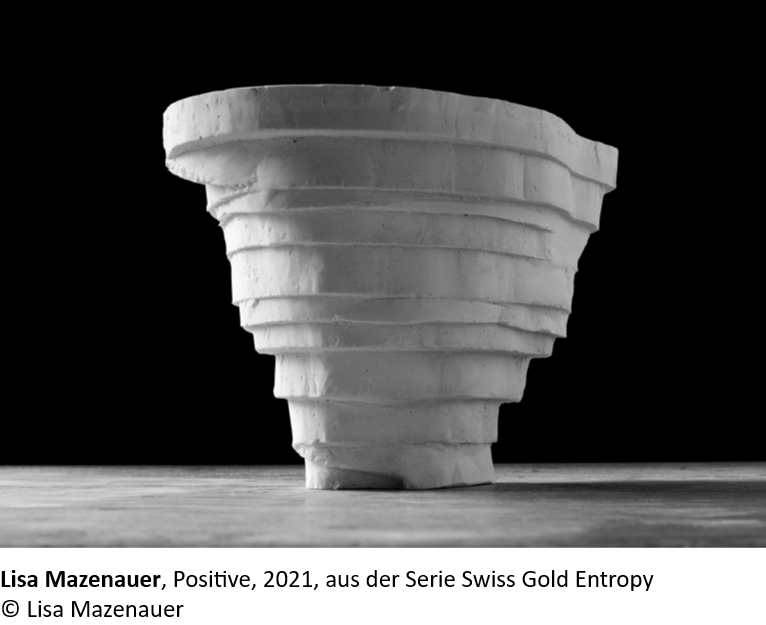 Die Schweizer Künstlerin Lisa Mazenauer (*1996) befasst sich in mehreren ihrer postdokumentarischen Arbeiten mit dem Abbau von Mineralien und dessen Einfluss auf Mensch und Umwelt. Sie nutzt dafür Archivmaterial, Videos und auch installative Elemente. Mit der Werkserie Swiss Gold Entropy untersucht Mazenauer beispielsweise die Beteiligung der Schweiz am Goldabbau in der Demokratischen Republik Kongo. Der Ausgangspunkt des Projekts bildet ein Zeitungsartikel aus dem Jahr 1982, in dem über die Absicht von Hans Mazenauer, dem Grossvater der Künstlerin, berichtet wird, in der Demokratischen Republik Kongo nach Gold zu suchen. Die Geschichte zeigt beispielhaft die Verflechtungen der Schweiz in den Rohstoffabbau und das Minengeschäft auf und stellt so die angebliche Neutralität des Landes in Frage.
