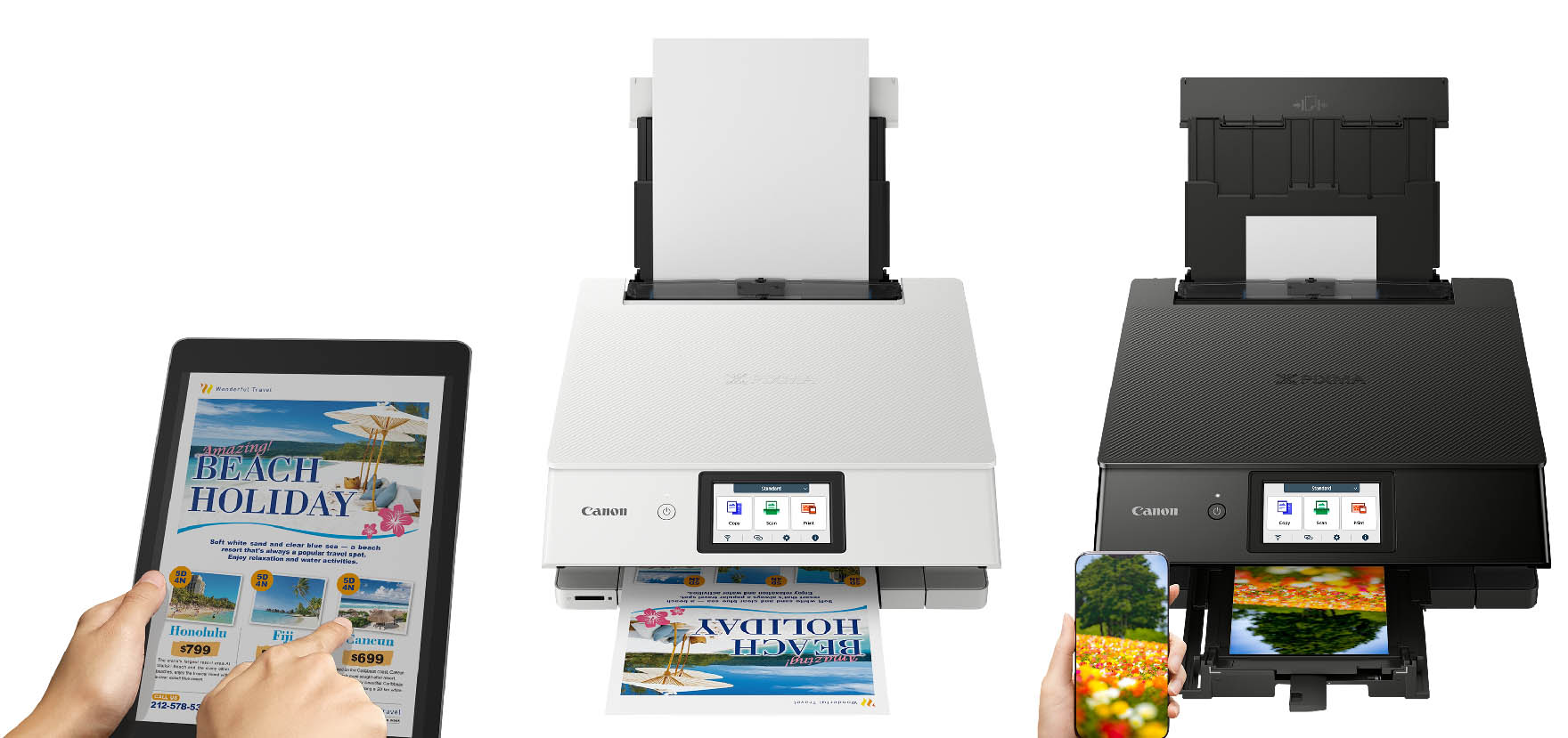 - Kabelloser Foto- und Dokumentendruck mit Unterstützung für 2,4- und 5-GHz sowie vom Mobilgerät mit der aktualisierten «Canon PRINT»-Mobile-App.