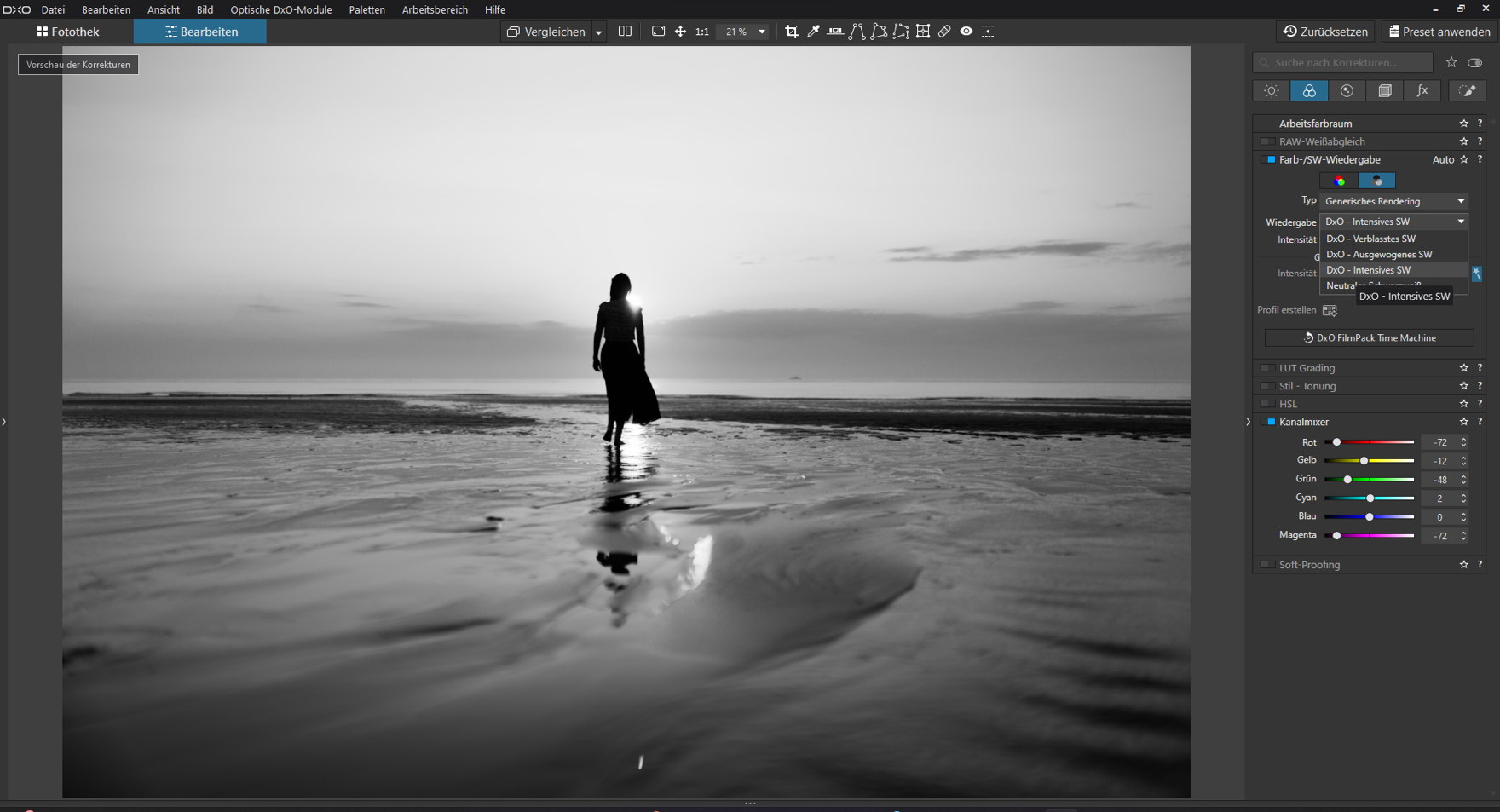 Ein natürlicher Schwarzweiss-Workflow: Genau wie DxO PhotoLab 7 jetzt punkto Farbmanagement komplettiert, bietet es neue Werkzeuge, die Fotografen dabei unterstützen, ihren idealen Monochrom-Workflow zu entwickeln. Die Benutzeroberfläche enthält eine neue Registerkarte zum Umschalten auf Schwarz-Weiss. Dazu verfügt das Programm über eine Vielzahl neuer Filmsimulationen. (Wie man sich auch aus DxO FilmPack kennt.) Ausserdem bietet PhotoLab 7 einen Sechs-Kanal-Mixer für vollständige Tonwertkontrolle über Schwarz-Weiss-Bilder.