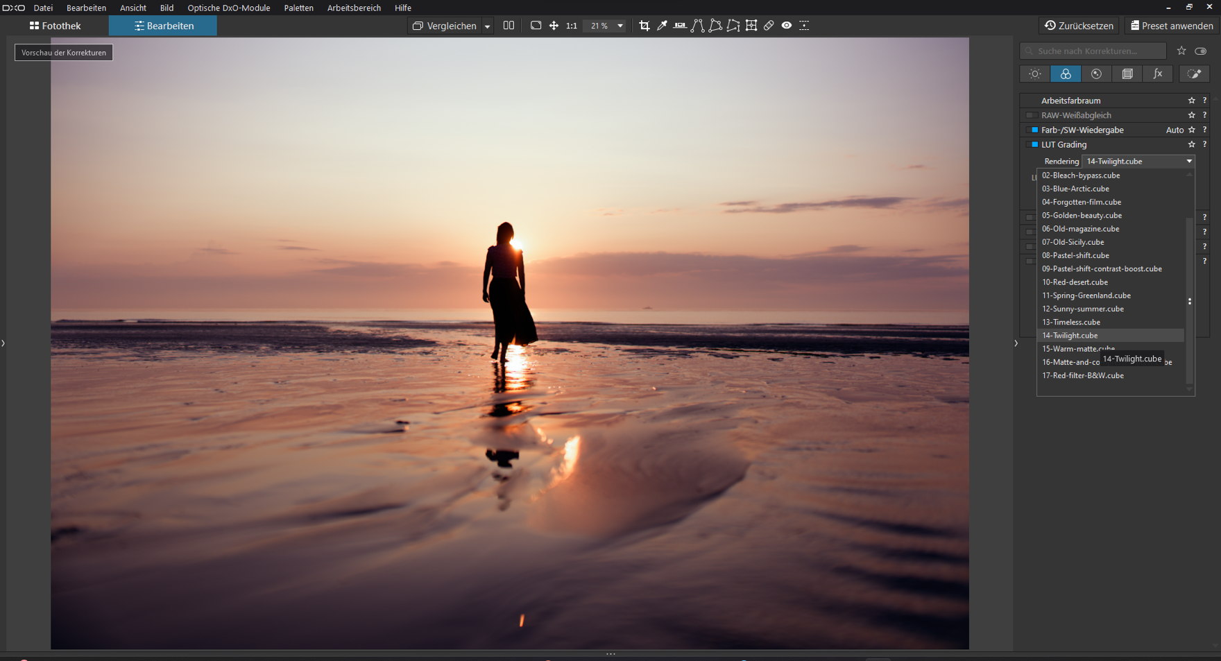 Grading wie die Kino-Profis: PhotoLab 7 unterstützt jetzt Lookup-Tabellen (LUTs), um Fotos quasi einen fertigen Farblook zu überziehen, und ist mit 17 DxO Starter-Presets ausgestattet. Diese Entwicklungen komplettieren die Fortschritte im Bereich Farbmanagement der Version 6, die überarbeitete Farbverarbeitungsalgorithmen, einen neuen erweiterten Arbeitsfarbraum (DxO Wide Gamut) und einen Soft-Proofing-Modus eingeführt hat.