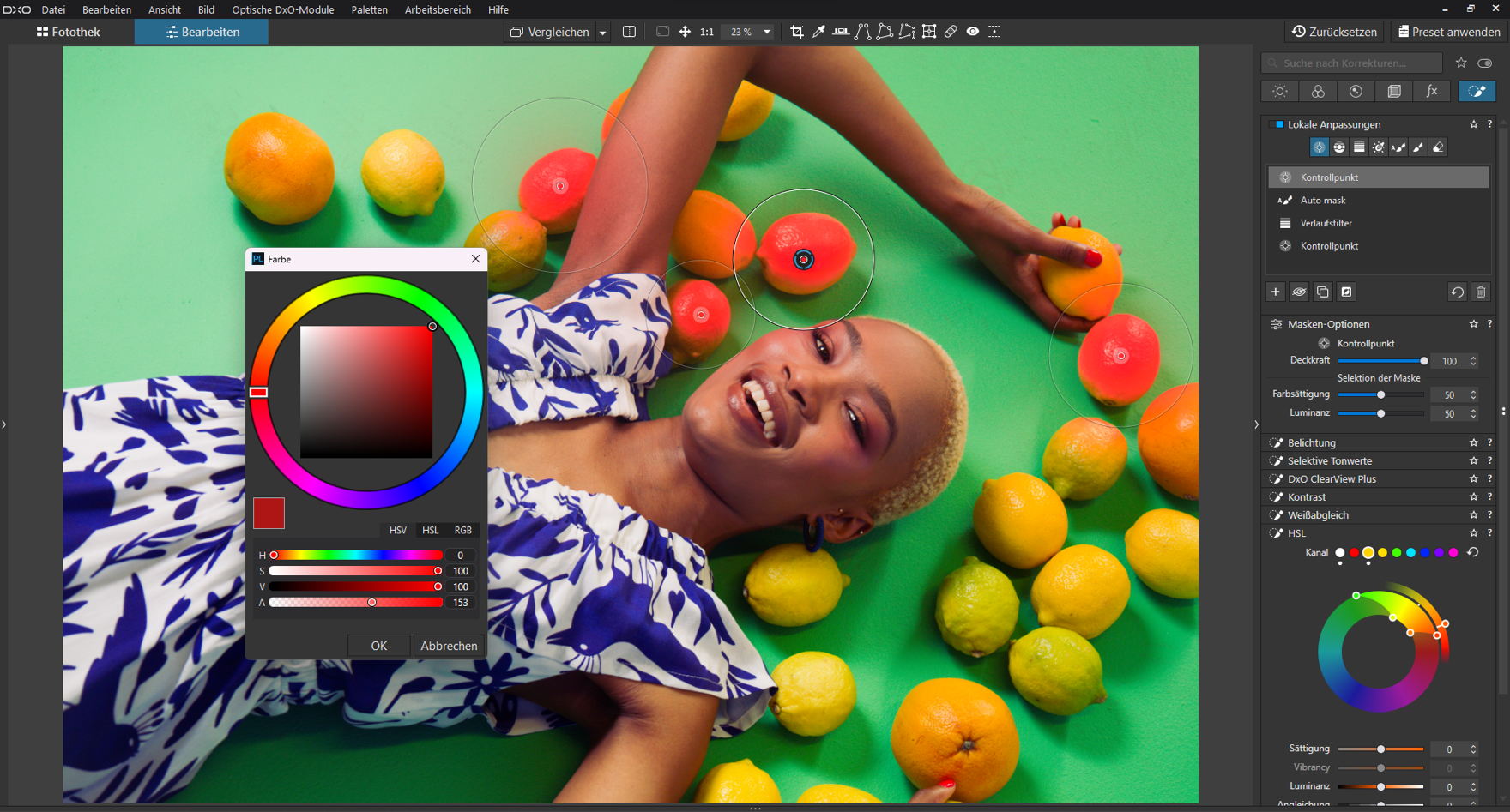 HSL-Bearbeitung als Bestandteil der Lokalen Anpassungen: Mit PhotoLab 7 wird auch die Farbgestaltung auf lokaler Ebene möglich. Fotografen können jetzt das leistungsstarke, aber einfach zu bedienende HSL-ColorWheel als Teil ihrer lokalen Anpassungen nutzen, um beispielsweise die Farbe der Kleidung eines Motivs zu verändern oder die Lichter einer Landschaft subtil aufzuwärmen. Die funktioniert und das in höchster Qualität und mit völliger kreativer Freiheit.